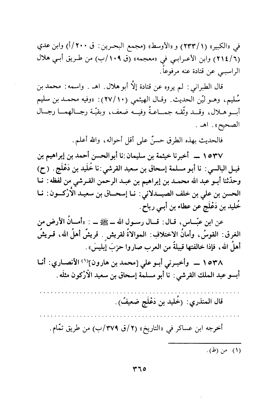 1537 - أخبرنا خيثمة بن سليمان: نا أبو الحسن أحمد بن إبراهيم بن قيل البالسي: نا أبو مسلمة إسحاق بن سعيد القرشي: نا خُلَيد بن دَعْلَج. (ح) وحدّثنا أبو عبد الله محمَّد بن إبراهيم بن عبد الرحمن القرشي من لفظه: نا الحسن بن علي بن خلف الصيدلاني: نا إسحاق بن سعيد الأرْكون: نا خُليد بن دَعْلَج عن عطاء بن أبي رباح.