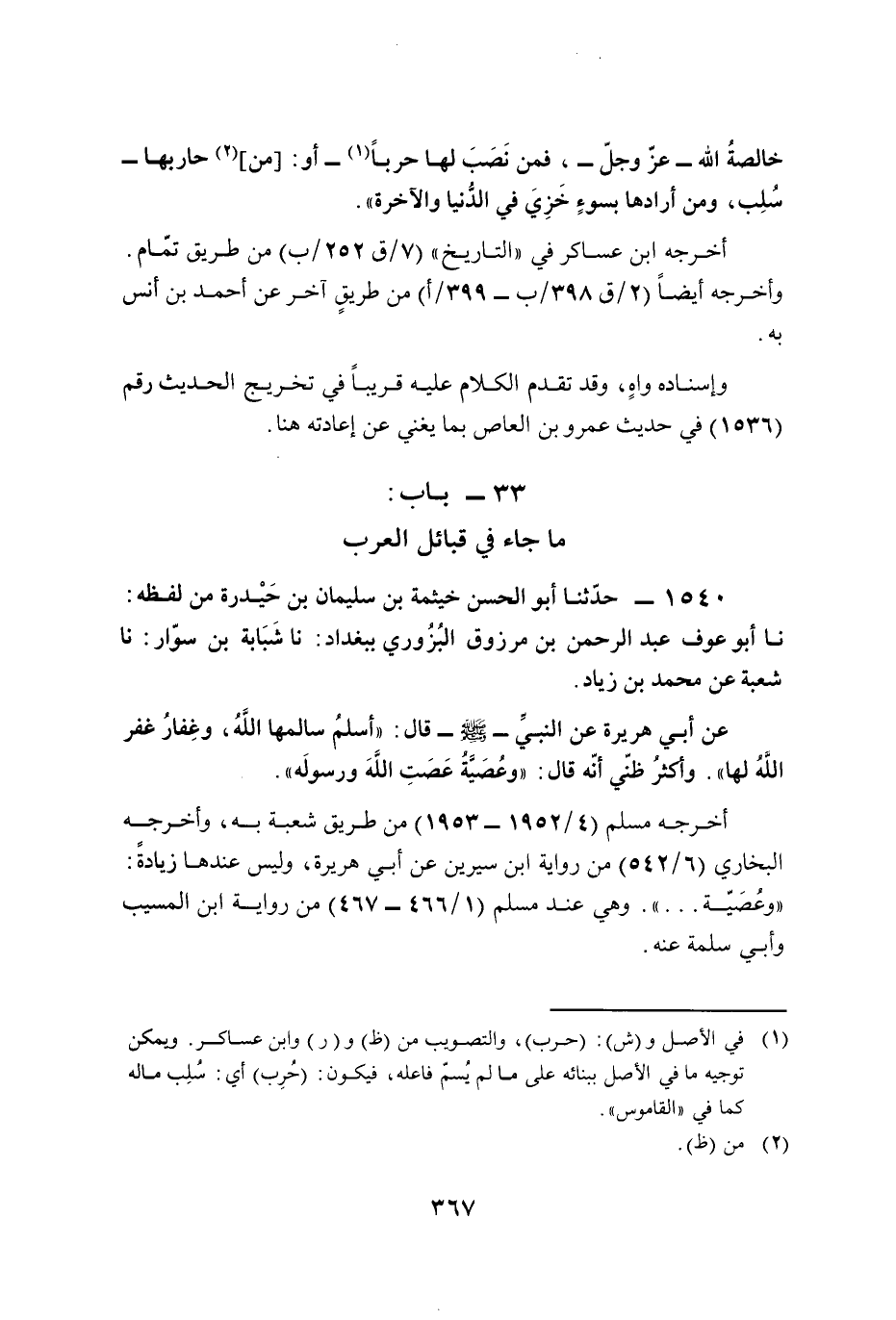 عن أبي هريرة عن النبيِّ - صلى الله عليه وسلم - قال: "أسلمُ سالمها اللهُ، وغِفارُ غفر الله لها". وأكثرُ ظنّي أنّه قال: "وعُصَيَّةُ عَصَتِ اللهَ ورسولَه".