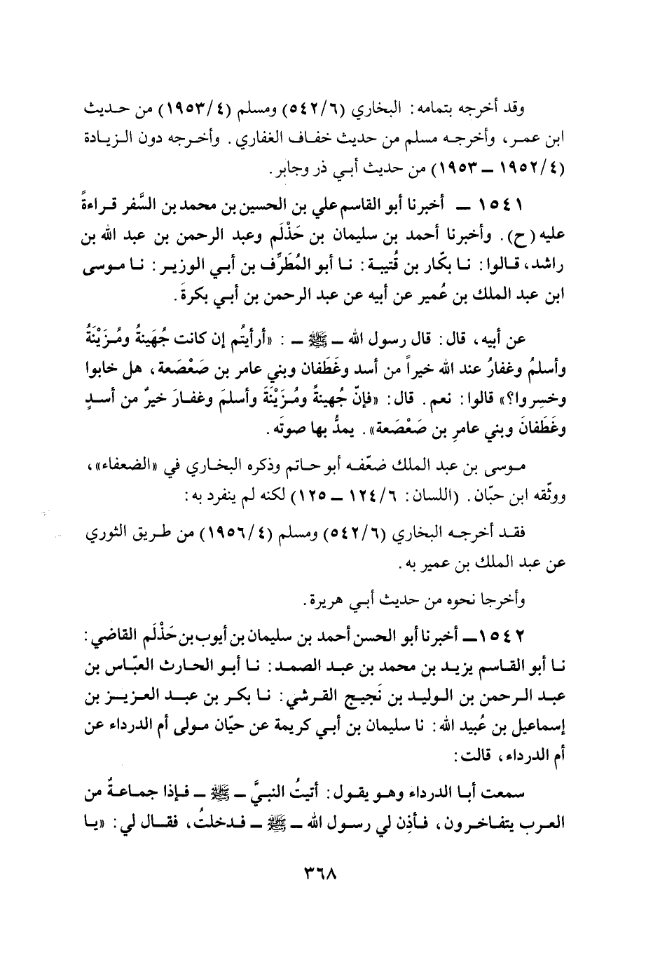 1541 - أخبرنا أبو القاسم علي بن الحسين بن محمد بن السَّفر قراءةً عليه (ح). وأخبرنا أحمد بن سليمان بن حَذْلَم وعبد الرحمن بن عبد الله بن راشد، قالوا: نا بكّار بن قُتيبة: نا أبو المُطَرِّف بن أبي الوزير: نا موسى ابن عبد الملك بن عُمير عن أبيه عن عبد الرحمن بن أبي بكرةَ.