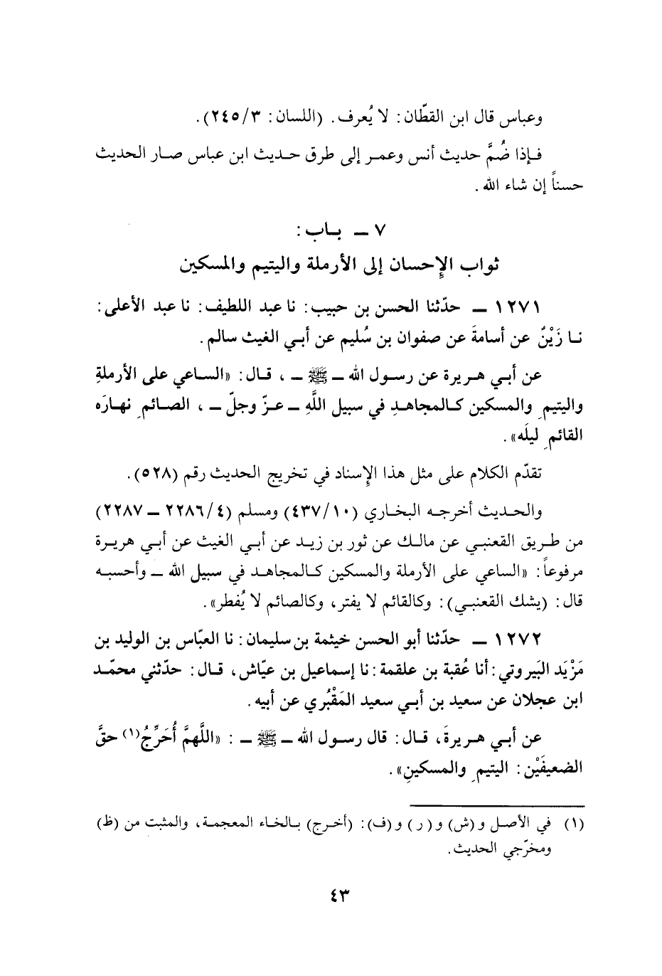 7 - باب: ثواب الإِحسان إلى الأرملة واليتيم والمسكين