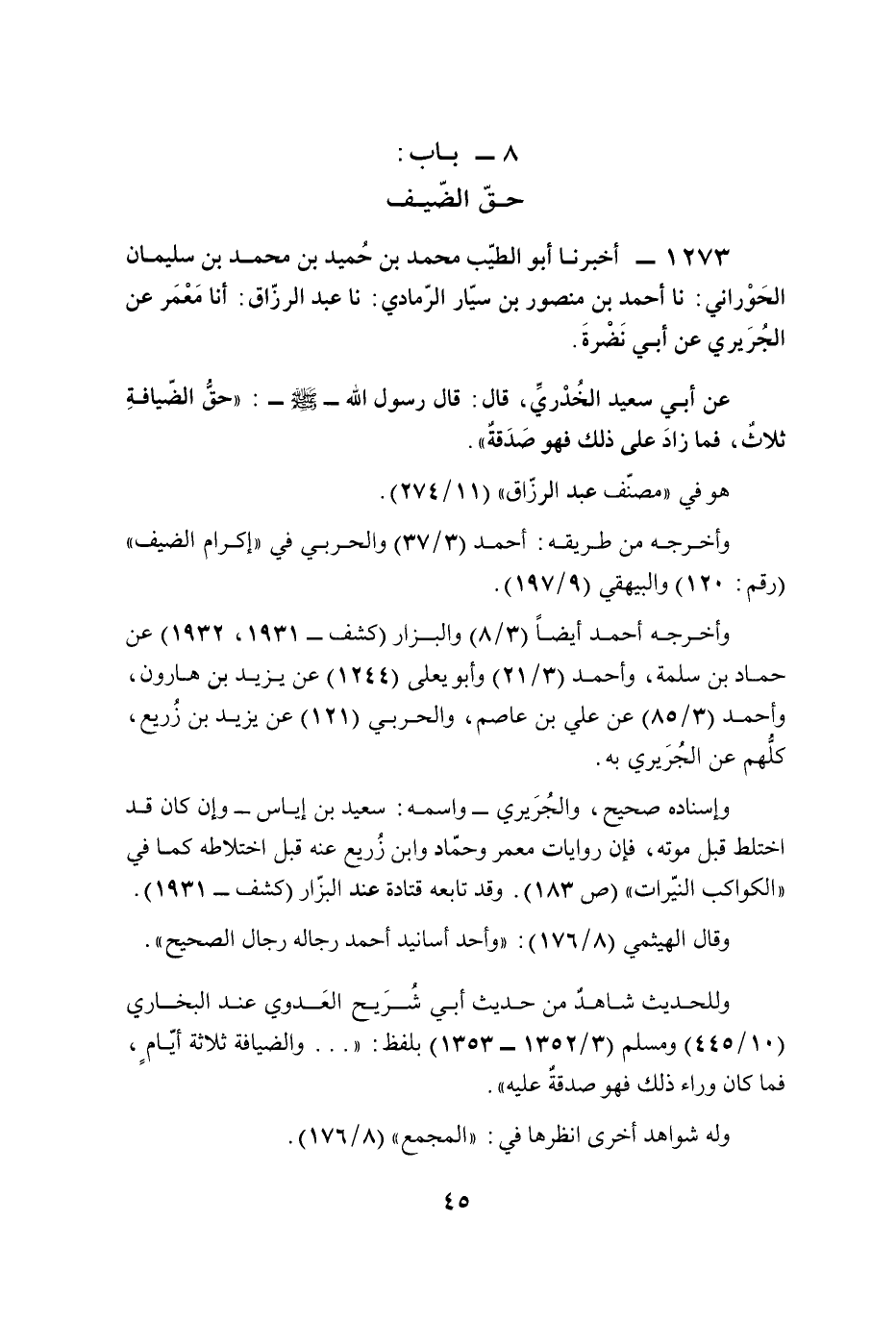 1273 - أخبرنا أبو الطيّب محمد بن حُميد بن محمد بن سليمان الحَوْراني: نا أحمد بن منصور بن سيّار الرّمادي: نا عبد الرزّاق: أنا مَعْمَر عن الجُرَيري عن أبي نَضْرةَ.