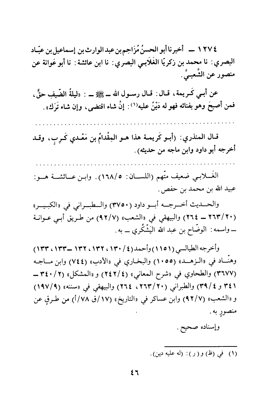 1274 - أخبرنا أبو الحسنُ مُزَاحِم بن عبد الوارث بن إسماعيل بن عبّاد البصري: نا محمد بن زكريّا الغَلاَبي البصري: نا ابن عائشة: نا أبو عَوانة عن منصور عن الشَّعبيِّ.