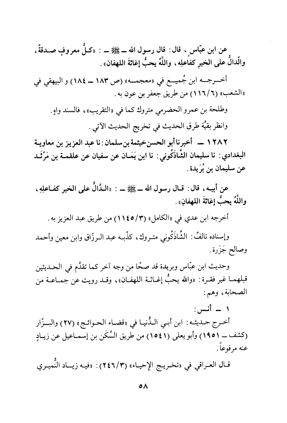 عن ابن عبّاسٍ، قال: قال رسول الله - صلى الله عليه وسلم -. "كلُّ معروفٍ صدقةٌ، والدّالُّ على الخيرِ كفاعلِه، واللهُ يحبُّ إغاثةَ اللهفان".