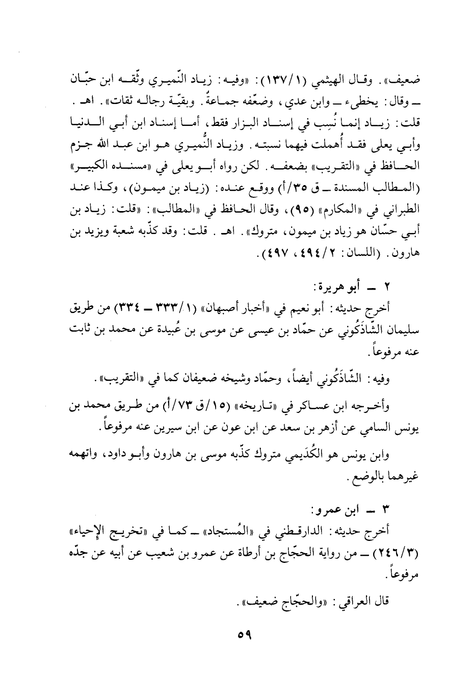 ضعيف". وقال الهيثمي (1/ 137): "وفيه: زياد النّميري وثّقه ابن حبّان -وقال: يخطئ- وابن عدي، وضعّفه جماعةٌ. وبقيّة رجاله ثقات". أهـ. قلت: زياد إنما نُسِب في إسناد البزّار فقط، أما إسناد ابن أبي الدنيا وأبي يعلى فقد أُهملت فيهما نسبته. وزياد النُّميري هو ابن عبد الله جزم الحافظ في "التقريب" بضعفه. لكن رواه أبو يعلى في "مسنده الكبير" (المطالب المسندة - ق 35/ أ) ووقع عنده: (زياد بن ميمون)، وكذا عند الطبراني في "المكارم" (95)، وقال الحافظ في "المطالب": "قلت: زياد بن أبي حسّان هو زياد بن ميمون، متروك". أهـ. قلت: وقد كذّبه شعبة ويزيد بن هارون. (اللسان: 2/ 494، 497).