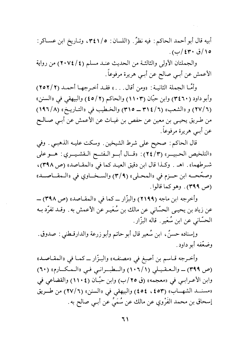 قال الحاكم: صحيح على شرط الشيخين. وسكت عليه الذهبي. وفي "التلخيص الحبير" (3/ 24): "قال أبو الفتح القشيري: هو على شرطهما". أهـ. وكذا قال ابن دقيق العيد كما في "المقاصد" (ص 398)، وصحّحه ابن حزم في "المحلى" (3/ 9) والسخاوي في "المقاصد" (ص 399). وهو كما قالوا.