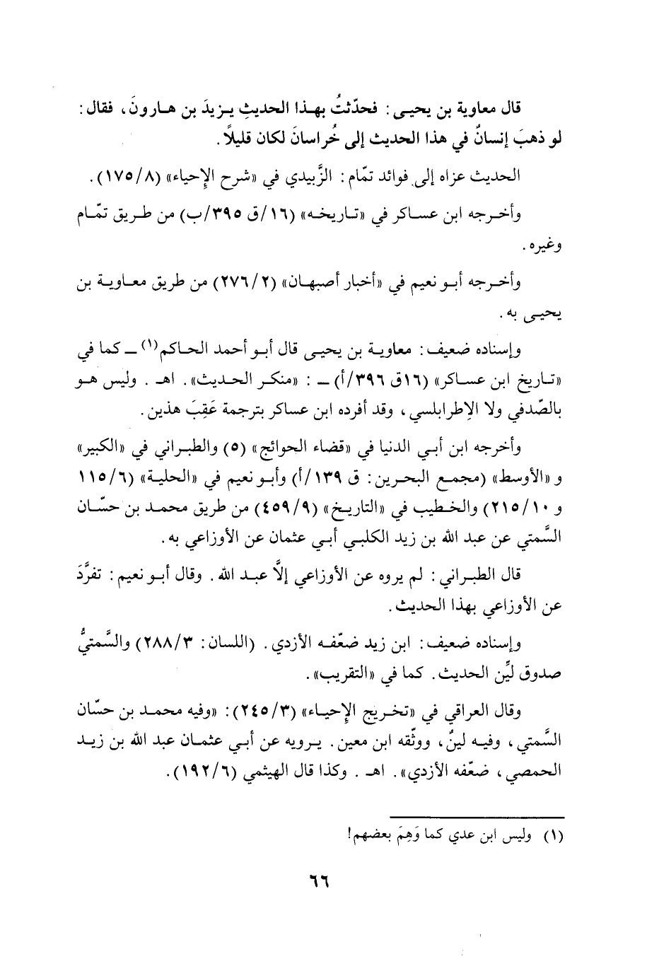 وإسناده ضعيف: معاوية بن يحيى قال أبو أحمد الحاكم (¬1) -كما في "تاريخ ابن عساكر" (16 ق 396/ أ) -: "منكر الحديث". أهـ. وليس هو بالصّدفي ولا الاطرابلسي، وقد أفرده ابن عساكر بترجمة عَقِبَ هذين.