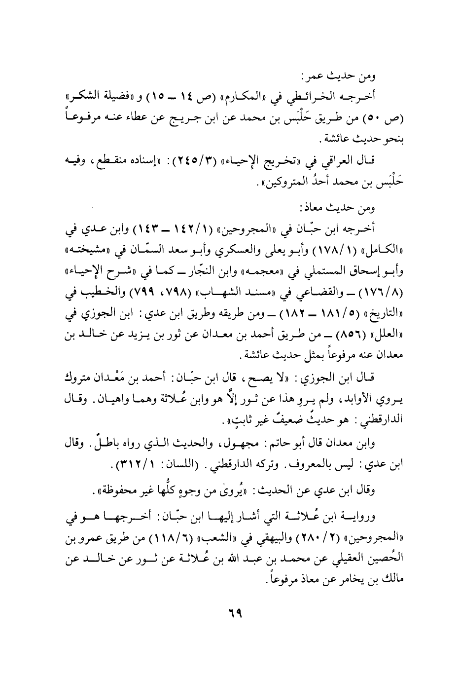 ورواية ابن عُلاثة التي أشار إليها ابن حبّان: أخرجها هو في "المجروحين" (2/ 280) والبيهقي في "الشعب" (6/ 118) من طريق عمرو بن الحُصين العقيلي عن محمد بن عبد الله بن عُلاثة عن ثور عن خالد عن مالك بن يخامر عن معاذ مرفوعًا.