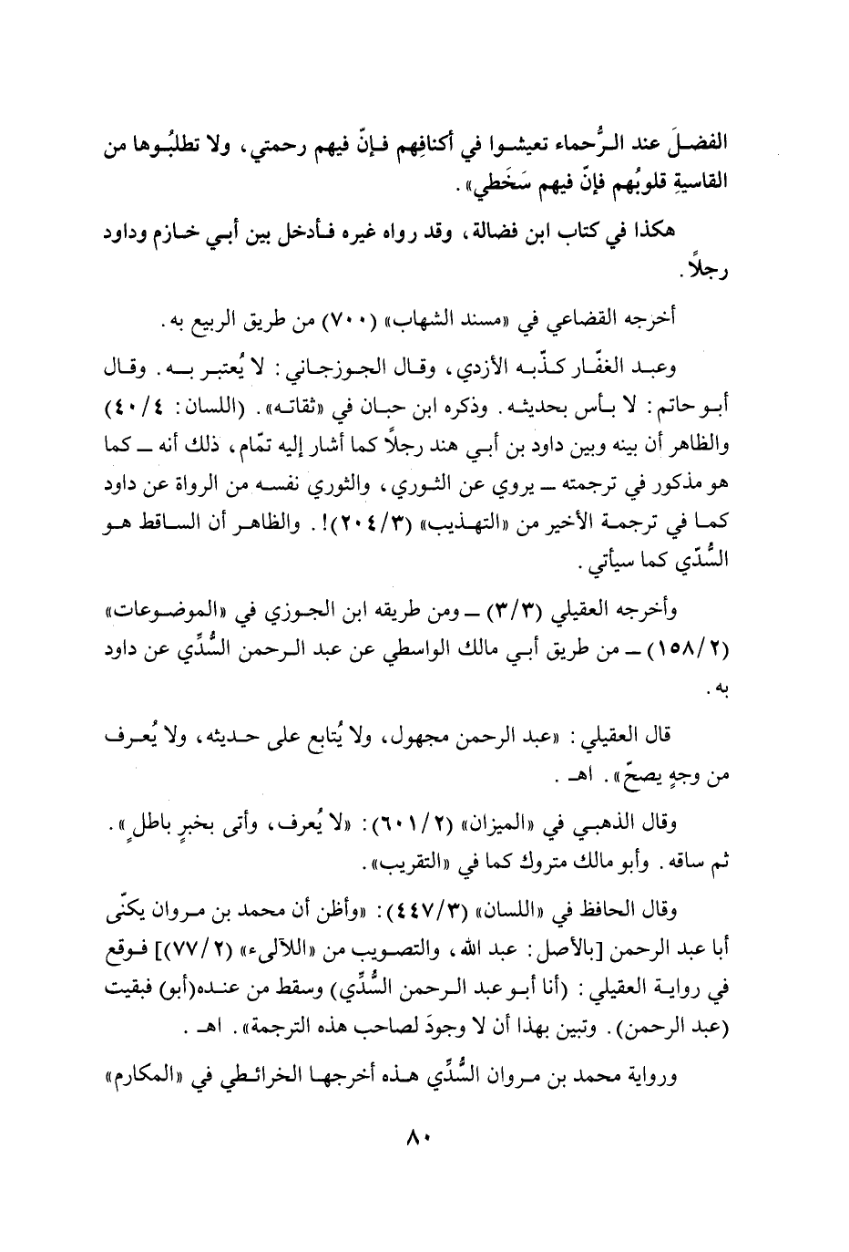 وقال الحافظ في "اللسان" (3/ 447): "وأظن أن محمد بن مروان يكنّى أبا عبد الرحمن [بالأصل: عبد الله، والتصويب من "اللآلئ" (2/ 77)] فوقع في رواية العقيلي: (أنا أبو عبد الرحمن السُّدِّي) وسقط من عنده (أبو) فبقيت (عبد الرحمن). وتبين بهذا أن لا وجودَ لصاحب هذه الترجمة". أهـ.