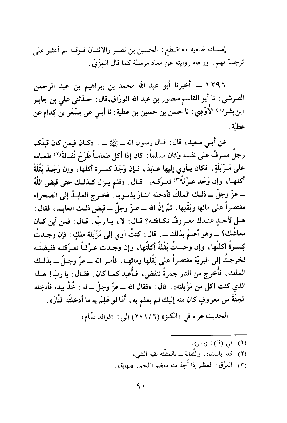 عن أبي سعيد، قال: قال رسول الله - صلى الله عليه وسلم -: "كان فيمن كان قبلَكم رجلٌ مسرفٌ على نفسه وكان مسلمًا: كان إذا أكل طعامًا طَرَحَ تُفالةَ (¬2) طعامه على مَزْبَلَةٍ، فكان يأوي إليها عابدٌ، فإن وَجَدَ كِسرة كلها، وإن وَجَدَ بَقْلَةً أكلها، وإن وَجَدَ عَرْقًا (¬3) تعرّقه". قال: "فلم يزل كذلك حتى قبض اللهُ -عَزَّ وجَلَّ- ذلك الملكَ فأدخله النارَ بذنوبه. فخرج العابدُ إلى الصحراء مقتصرًا على مائها وبَقْلِها، ثمّ إنّ الله -عَزَّ وجَلَّ- قبض ذلك العابد، فقال: هل لأحدٍ عندك معروفٌ تكافئه؟ قال: لا، يا ربِّ. قال: فمن أين كان معاشُك؟ -وهو أعلمُ بذلك-. قال: كنتُ آوي إلى مَزْبَلة ملكٍ. فإن وجدتُ كِسرةً أكلتُها، وإن وجدتُ بَقْلةً أكلتُها، وإن وجدت عَرْقًا تعرّقته فقبضتَه فخرجتُ إلى البريّة مقتصرًا علي بَقْلها ومائها. فأمر الله -عَزَّ وجَلَّ- بذلك الملك، فأُخرج من النار جمرةً تنفض، فأُعيد كما كان. فقال: يا ربّ! هذا الذي كنت آكل من مَزْبَلته". قال: "فقال الله -عَزَّ وجَلَّ- له: خْذْ بيده فأدخِله الجنّةَ من معروفٍ كان منه إليك لم يعلم به، أَمَا لو عَلِمَ به ما أدخلتُه النَّارَ".