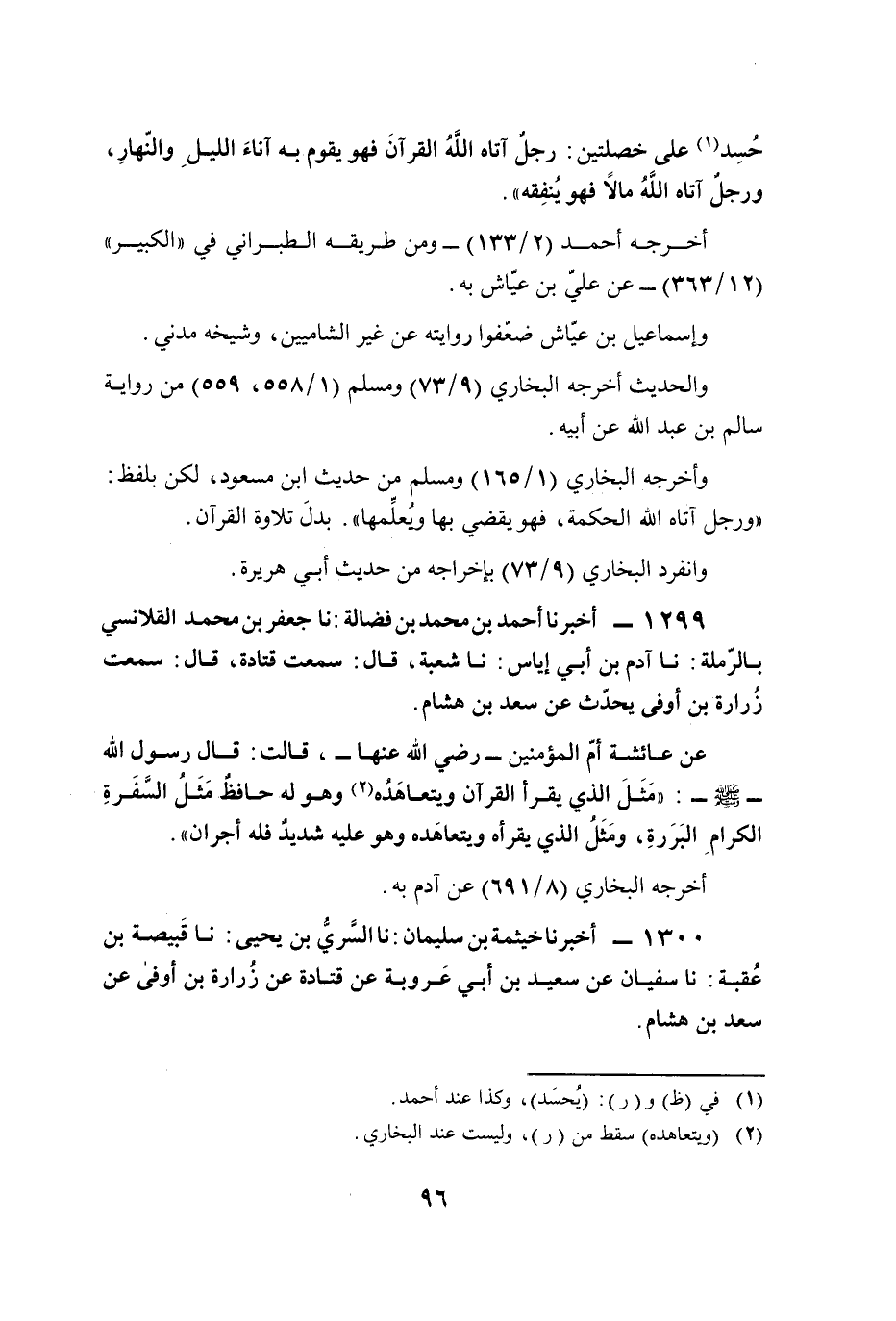 1299 - أخبرنا أحمد بن محمد بن فضالة: نا جعفر بن محمد القلانسي بالرّملة: نا آدم بن أبي إياس: نا شعبة، قال: سمعت قتادة، قال: سمعت زُرارة بن أوفى يحدّث عن سعد بن هشام.