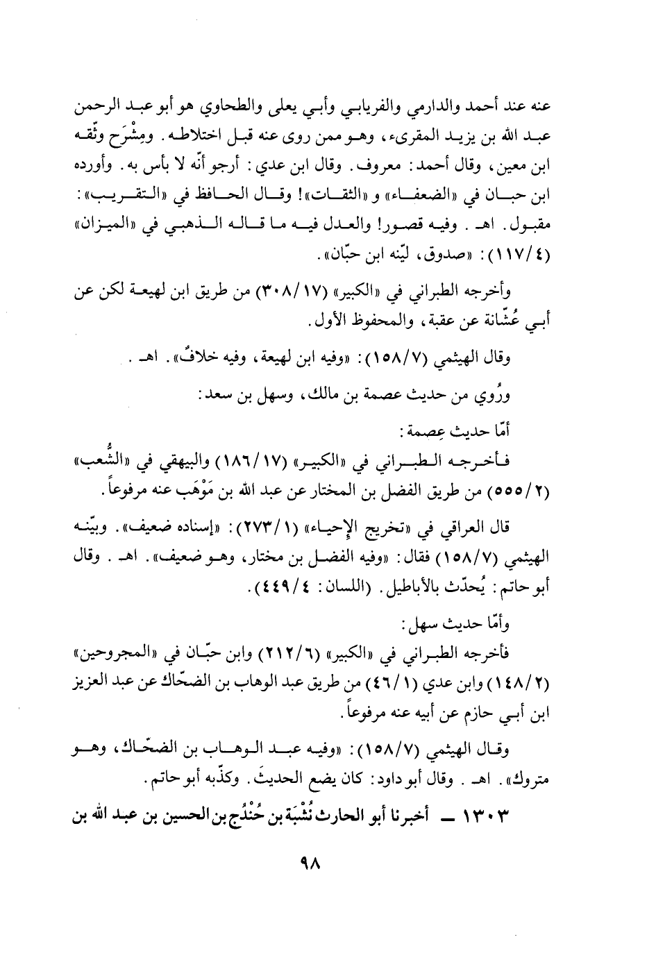 عنه عند أحمد والدارمي والفريابي وأبي يعلى والطحاوي هو أبو عبد الرحمن عبد الله بن يزيد المقرىء، وهو ممن روى عنه قبل اختلاطه. ومِشْرَح وثّقه ابن معين، وقال أحمد: معروف. وقال ابن عدي: أرجو أنّه لا بأس به. وأورده ابن حبان في "الضعفاء" و"الثقات"! وقال الحافظ في "التقريب": مقبول. أهـ. وفيه قصور! والعدل فيه ما قاله الذهبي في "الميزان" (4/ 117): "صدوق، ليّنه ابن حبّان".