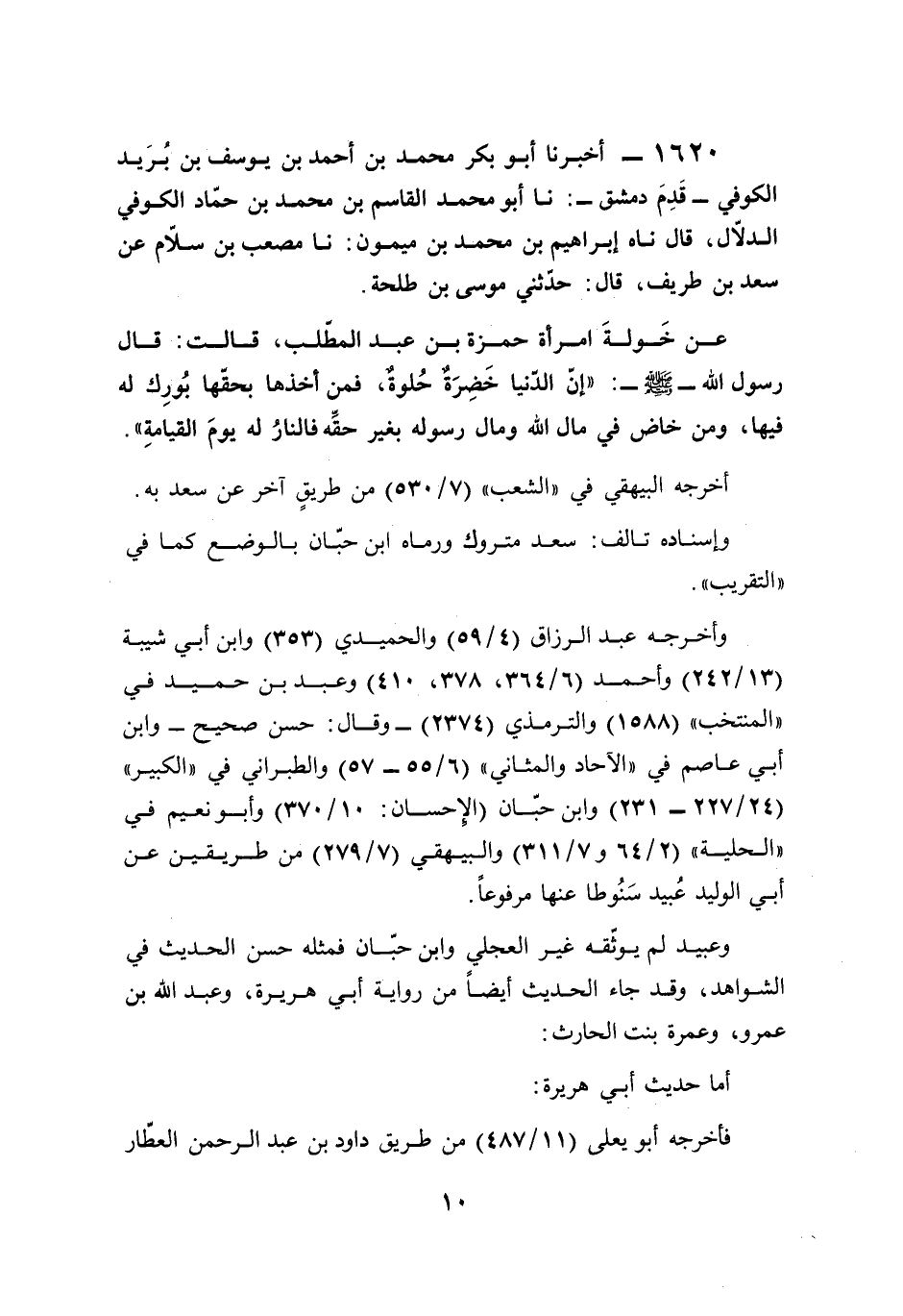 1620 - أخبرنا أبو بكر محمَّد بن أحمد بن يوسف بن بُرَيد الكوفي -قَدِمَ دمشق-: نا أبو محمَّد القاسم بن محمَّد بن حمّاد الكوفي الدلَّال، قال ناه إبراهيم بن محمَّد بن ميمون: نا مصعب بن سلّام عن