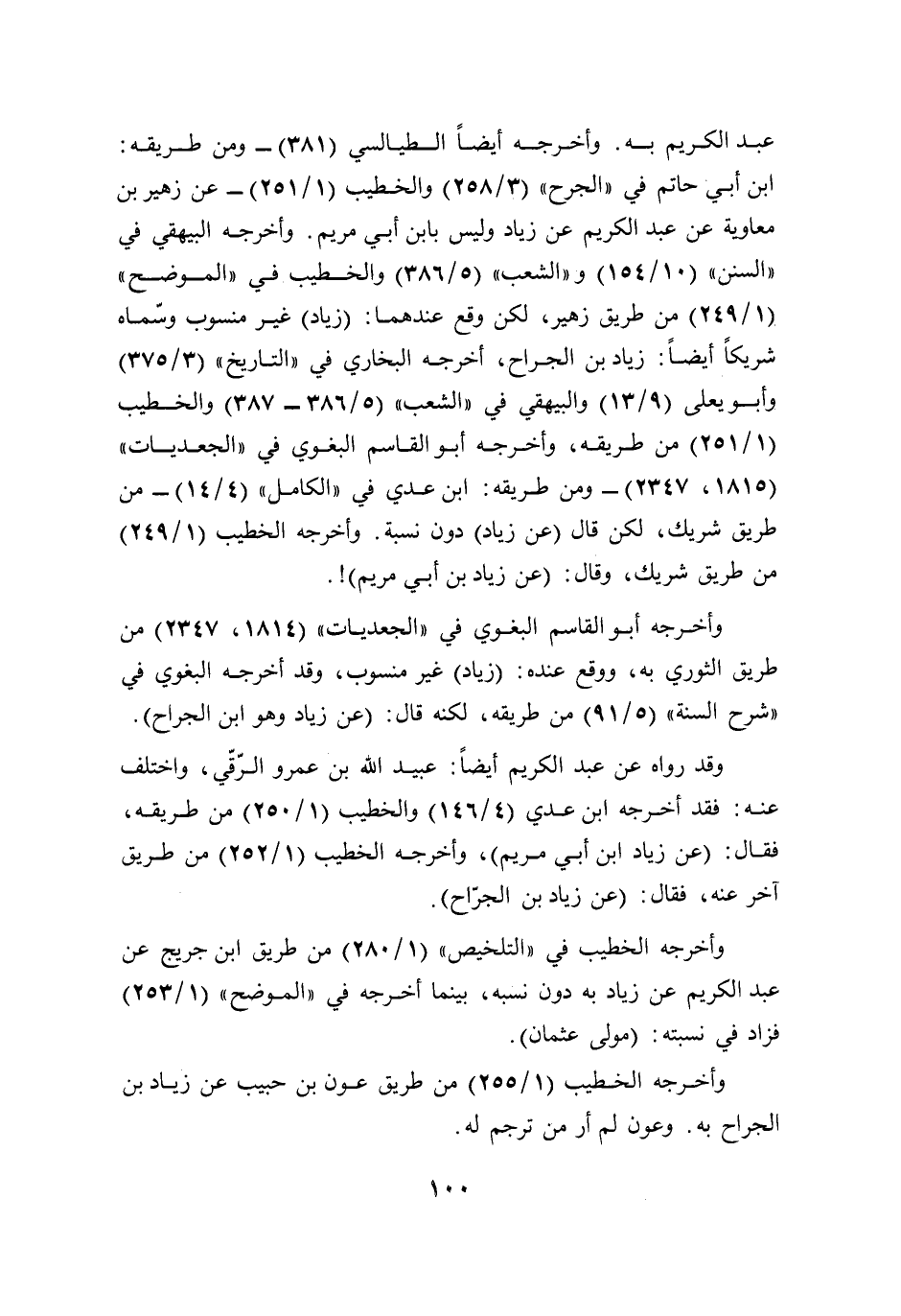 عبد الكريم به. وأخرجه أيضًا الطيالسي (381) -ومن طريقه: ابن أبي حاتم في "الجرح" (3/ 258) والخطيب (1/ 251) - عن زهير بن معاوية عن عبد الكريم عن زياد وليس بابن أبي مريم. وأخرجه البيهقي في "السنن" (10/ 154) و"الشعب" (5/ 386) والخطيب في "الموضح" (1/ 249) من طريق زهير، لكن وقع عندهما: (زياد) غير منسوب وسّماه شريكًا أيضًا: زياد بن الجراح، أخرجه البخاري في "التاريخ" (3/ 375) وأبو يعلى (9/ 13) والبيهقي في "الشعب" (5/ 386 - 387) والخطيب (1/ 251) من طريقه، وأخرجه أبو القاسم البغوي في "الجعديات" (1815، 2347) -ومن طريقه: ابن عدي في "الكامل" (4/ 14) - من طريق شريك، لكن قال (عن زياد) دون نسبة. وأخرجه الخطيب (1/ 249) من طريق شريك، وقال: (عن زياد بن أبي مريم)!.