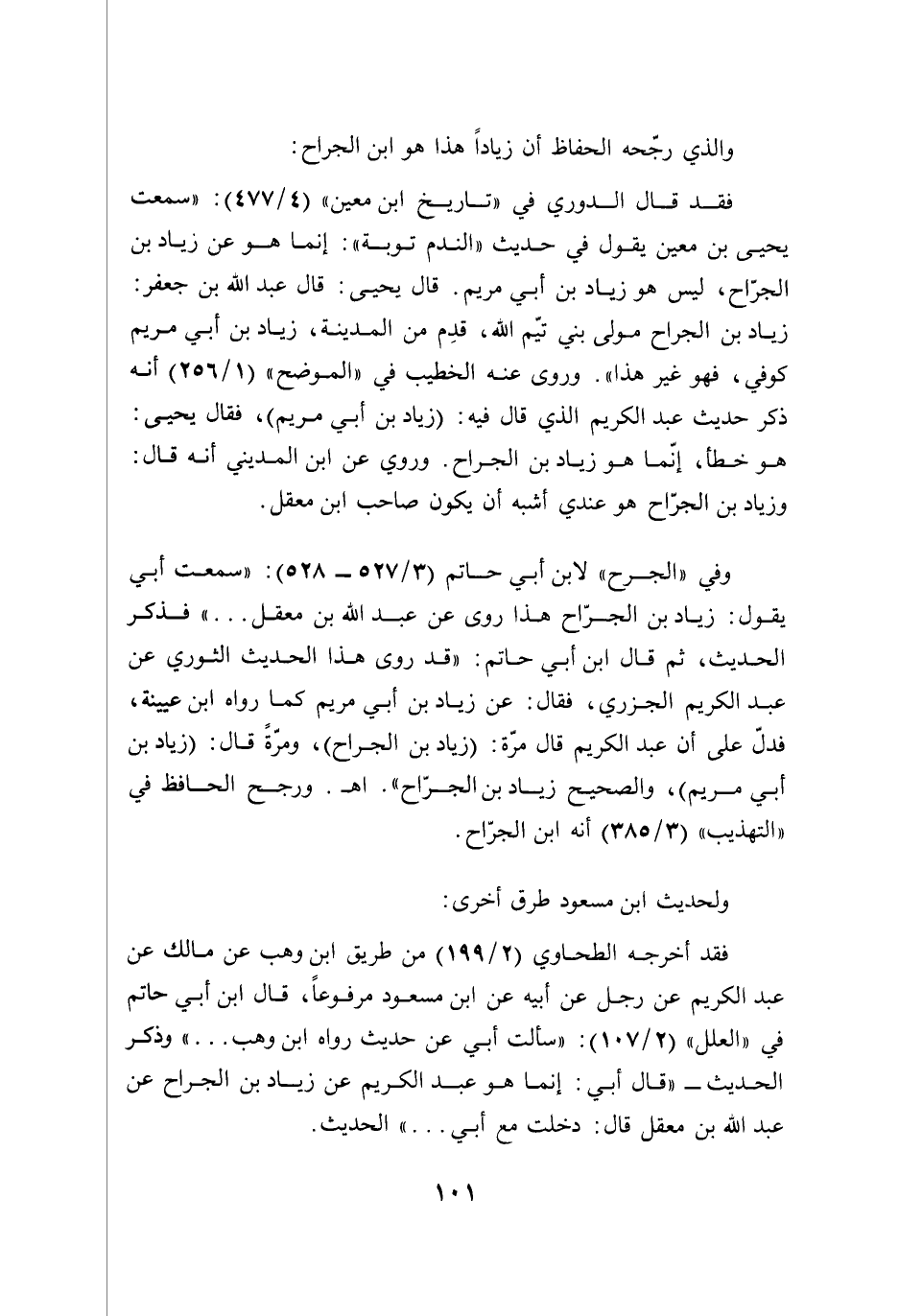 وفي "الجرح" لابن أبي حاتم (3/ 527 - 528): "سمعت أبي يقول: زياد بن الجرّاح هذا روى عن عبد الله بن معقل ... ، فذكر الحديث، ثم قال ابن أبي حاتم: "قد روى هذا الحديث الثوري عن عبد الكريم الجزري، فقال: عن زياد بن أبي مريم كما رواه ابن عيينة، فدلّ على أن عبد الكريم قال مرّة: (زياد بن الجراح)، ومرةً قال: (زياد بن أبي مريم)، والصحيح زياد بن الجرّاح". أهـ. ورجح الحافظ في "التهذيب" (3/ 385) أنه ابن الجرّاح.
