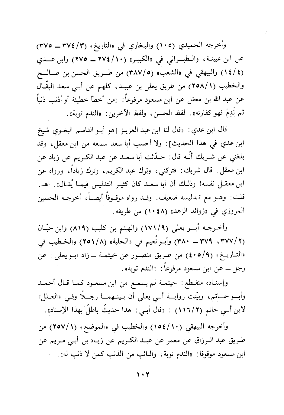وأخرجه أبو يعلى (9/ 171) والهيثم بن كليب (819) وابن حبّان (2/ 377، 379 - 380) وأبو نُعيم في "الحلية" (8/ 251) والخطيب في "التاريخ" (9/ 405) من طريق منصور عن خيثمة -زاد أبو يعلى: عن رجل- عن ابن مسعود مرفوعًا: "الندم توبة".