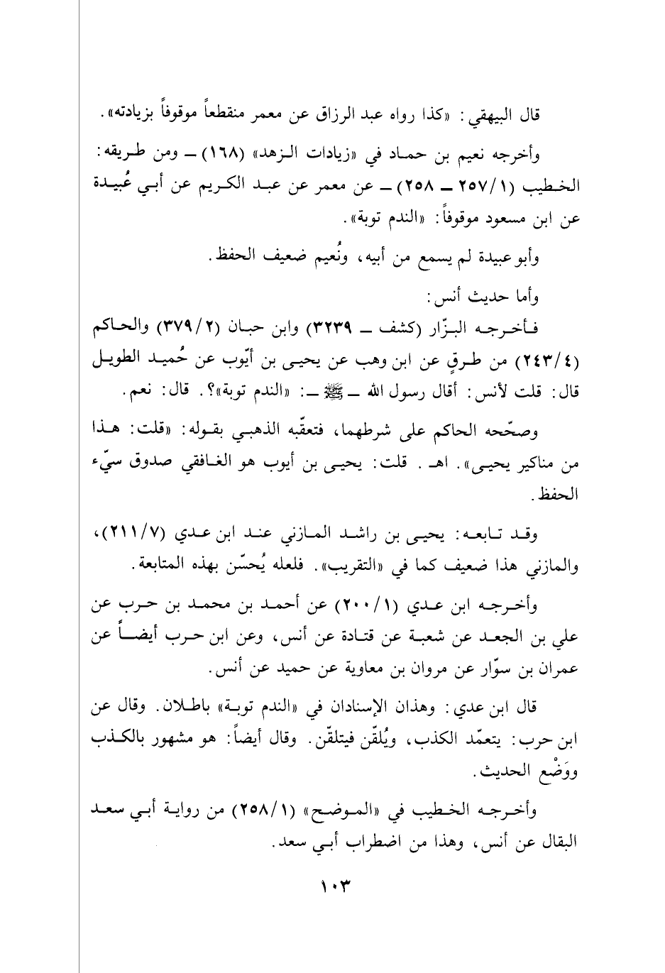 قال ابن عدي: وهذان الإسنادان في "الندم توبة" باطلان. وقال عن ابن حرب: يتعمّد الكذب، وُيلقّن فيتلقّن. وقال أيضًا: هو مشهور بالكذب ووَضْع الحديث.