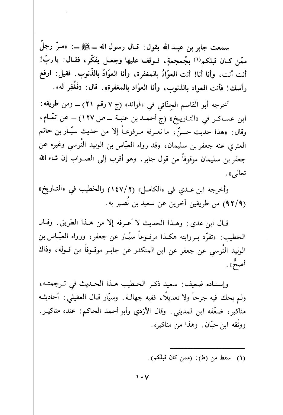 قال ابن عدي: وهذا الحديث لا أعرفه إلا من هذا الطريق. وقال الخطيب: "تفرّد بروايته هكذا مرفوعًا سيّار عن جعفر، ورواه العبّاس بن الوليد النَّرسي عن جعفر عن ابن المنكدر عن جابر موقوفًا من قوله، وذاك أصحُّ".