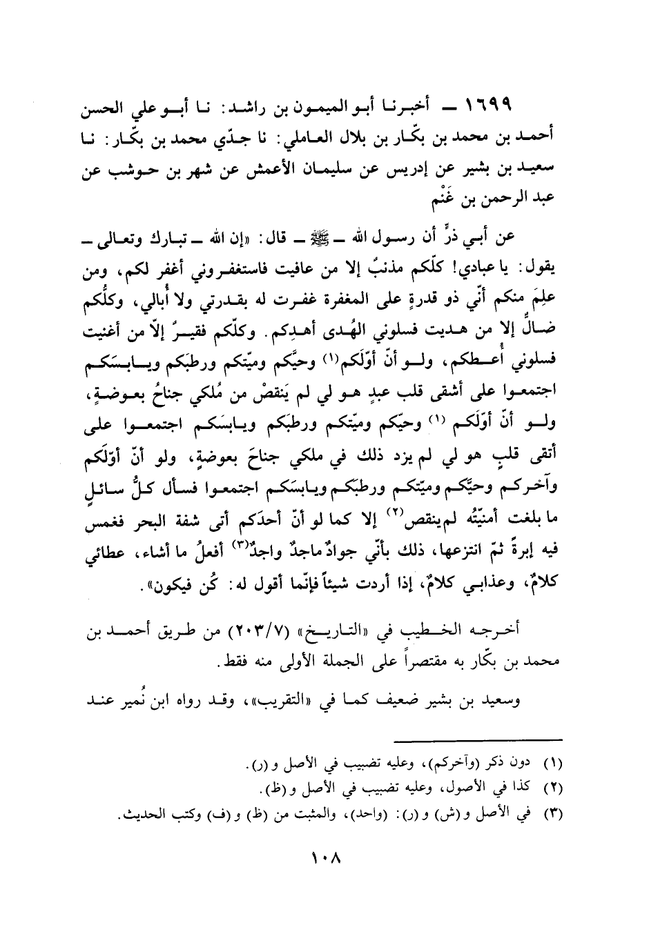 عن أبي ذرٍّ أن رسول الله - صلى الله عليه وسلم - قال: "إن الله -تبارك وتعالى- يقول: يا عبادي! كلّكم مذنبٌ؛ إلا من عافيت فاستغفروني أغفر لكم، ومن علِمَ منكم أنّي ذو قدرةٍ على المغفرة غفرت له بقدرتي ولا أبالي، وكلُّكم ضالٌّ إلا من هديت فسلوني الهُدى أهدِكم. وكلّكم فقير إلَّا من أغنيت فسلوني أُعطكم، ولو أنّ أوّلَكم (¬1) وحيَّكم وميّتكم ورطبَكم ويابسَكم اجتمعوا على أشقى قلب عبدٍ هو لي لم يَنقصْ من مُلكي جناحُ بعوضةٍ، ولو أنّ أوّلَكم (1) وحيّكم وميتكم ورطبَكم ويابسَكم اجتمعوا على أتقى قلبٍ هو لي لم يزد ذلك في ملكي جناحَ بعوضةٍ، ولو أنّ أوّلَكم وآخركم وحيَّكم وميّتكم ورطبكم ويابسَكم اجتمعوا فسأل كلُّ سائلٍ ما بلغت أمنيّتُه لم ينقص (¬2) إلا كما لو أنّ أحدَكم أتى شفة البحر فغمس فيه إبرةً ثمّ انتزعها، ذلك بأنّي جوادٌ ماجدٌ واجدٌ (¬3) أفعلُ ما أشاء، عطائي كلامٌ، وعذابي كلامٌ، إذا أردت شيئًا فإنّما أقول له: كن فيكون".