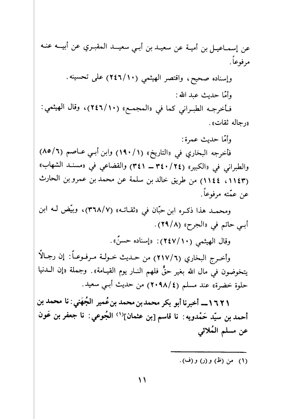 1621 - أخبرنا أبو بكر محمد بن محمَّد بن عُمير الجُهَني: نا محمَّد بن أحمد بن سيّد حَمْدويه: نا قاسم [بن عثمان] (¬1) الجُوعي: نا جعفر بن عَون عن مسلم المُلائي