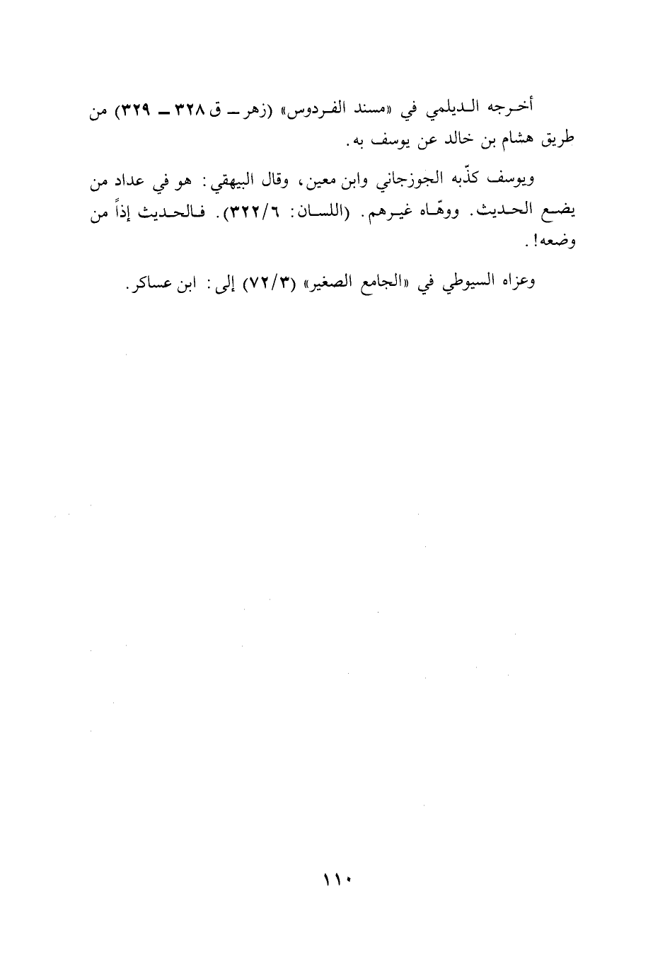 ويوسف كذّبه الجوزجاني وابن معين، وقال البيهقي: هو في عداد من يضع الحديث. ووهّاه غيرهم. (اللسان: 6/ 322). فالحديث إذًا من وضعه!.