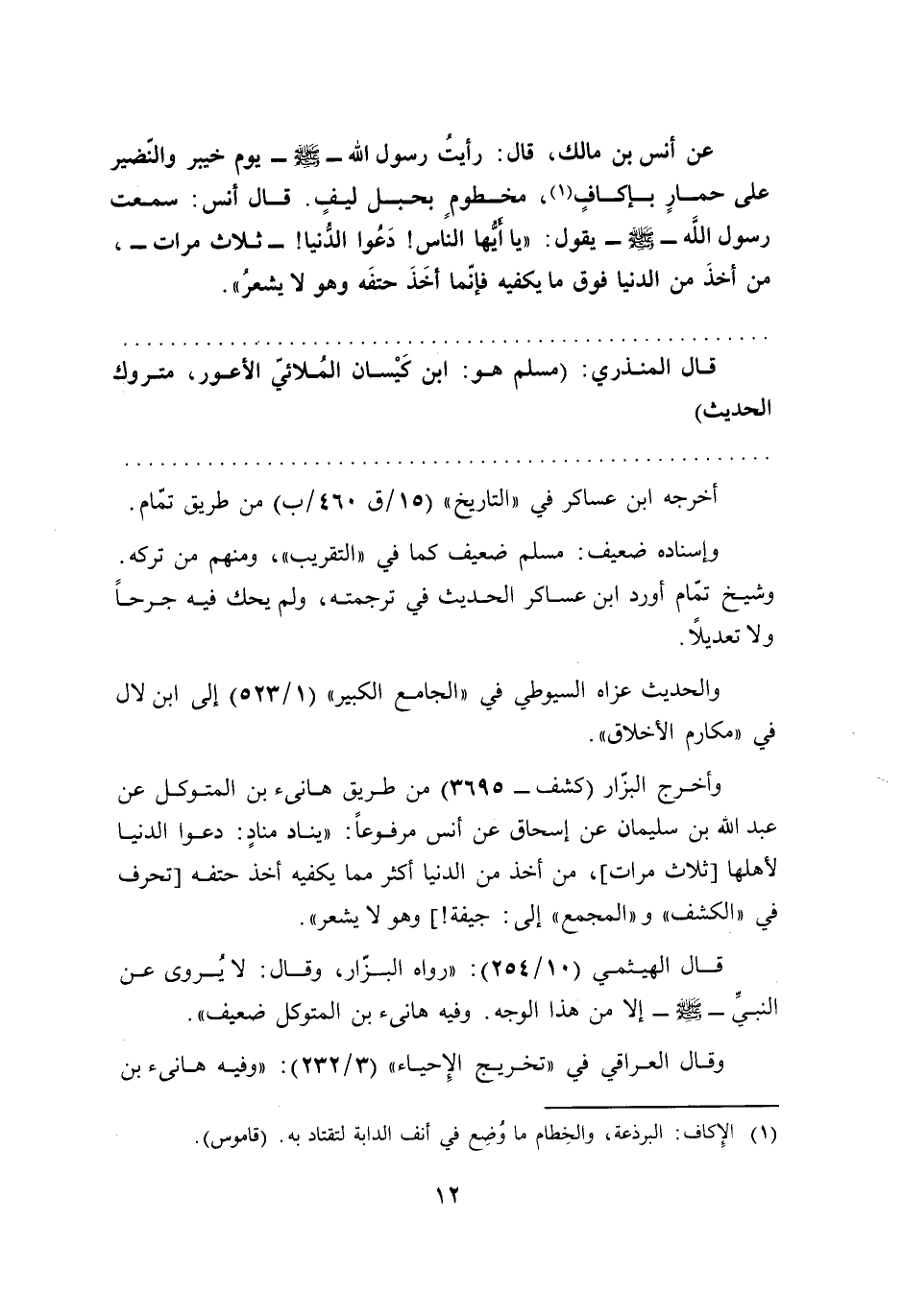 وأخرج البزّار (كشف- 3695) من طريق هانئ بن المتوكل عن عبد الله بن سليمان عن إسحاق عن أنس مرفوعًا: "يناد منادٍ: دعوا الدنيا لأهلها [ثلاث مرات]، من أخذ من الدنيا أكثر مما يكفيه أخذ حتفه [تحرف في "الكشف" و"المجمع" إلى: جيفة!] وهو لا يشعر".