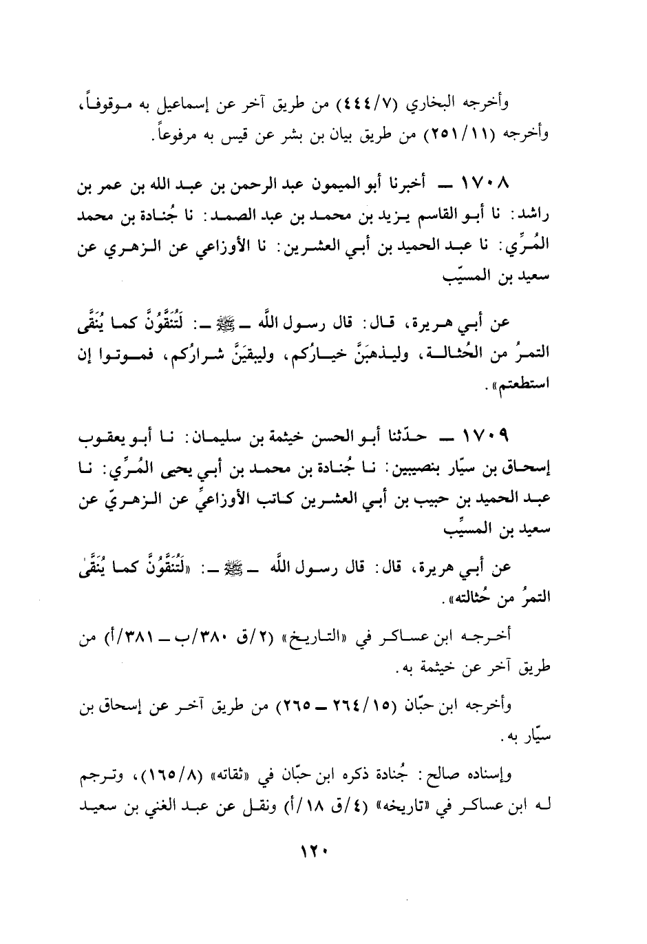 1709 - حدّثنا أبو الحسن خيثمة بن سليمان: نا أبو يعقوب إسحاق بن سيّار بنصيبين: نا جُنادة بن محمَّد بن أبي يحيى المُرِّي: نا عبد الحميد بن حبيب بن أبي العشرين كاتب الأوزاعيِّ عن الزهريّ عن سعيد بن المسيِّب
