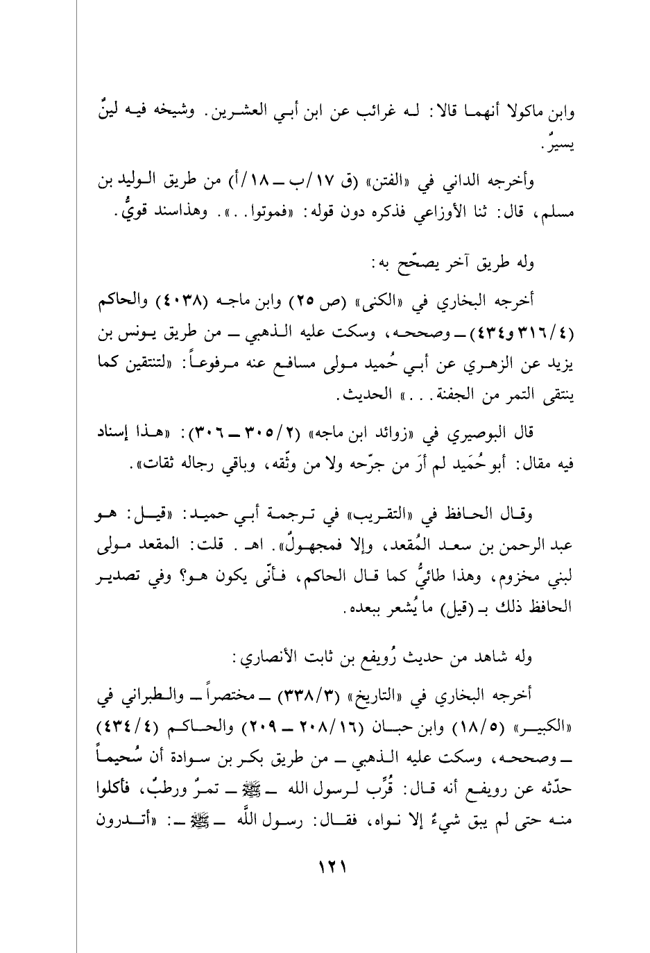 وقال الحافظ في "التقريب" في ترجمة أبي حميد: "قيل: هو عبد الرحمن بن سعد المُقعد، وإلا فمجهولٌ". أهـ. قلت: المقعد مولى لبني مخزوم، وهذا طائيُّ كما قال الحاكم، فأنّى يكون هو؟ وفي تصدير الحافظ ذلك بـ (قيل) ما يُشعر ببعده.