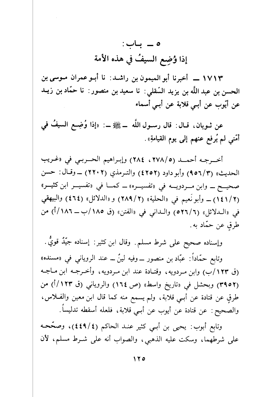 1713 - أخبرنا أبو الميمون بن راشد: نا أبو عمران موسى بن الحسن بن عبد الله بن يزيد السّقلي: نا سعيد بن منصور: نا حمّاد بن زيد عن أيّوب عن أبي قلابة عن أبي أسماء