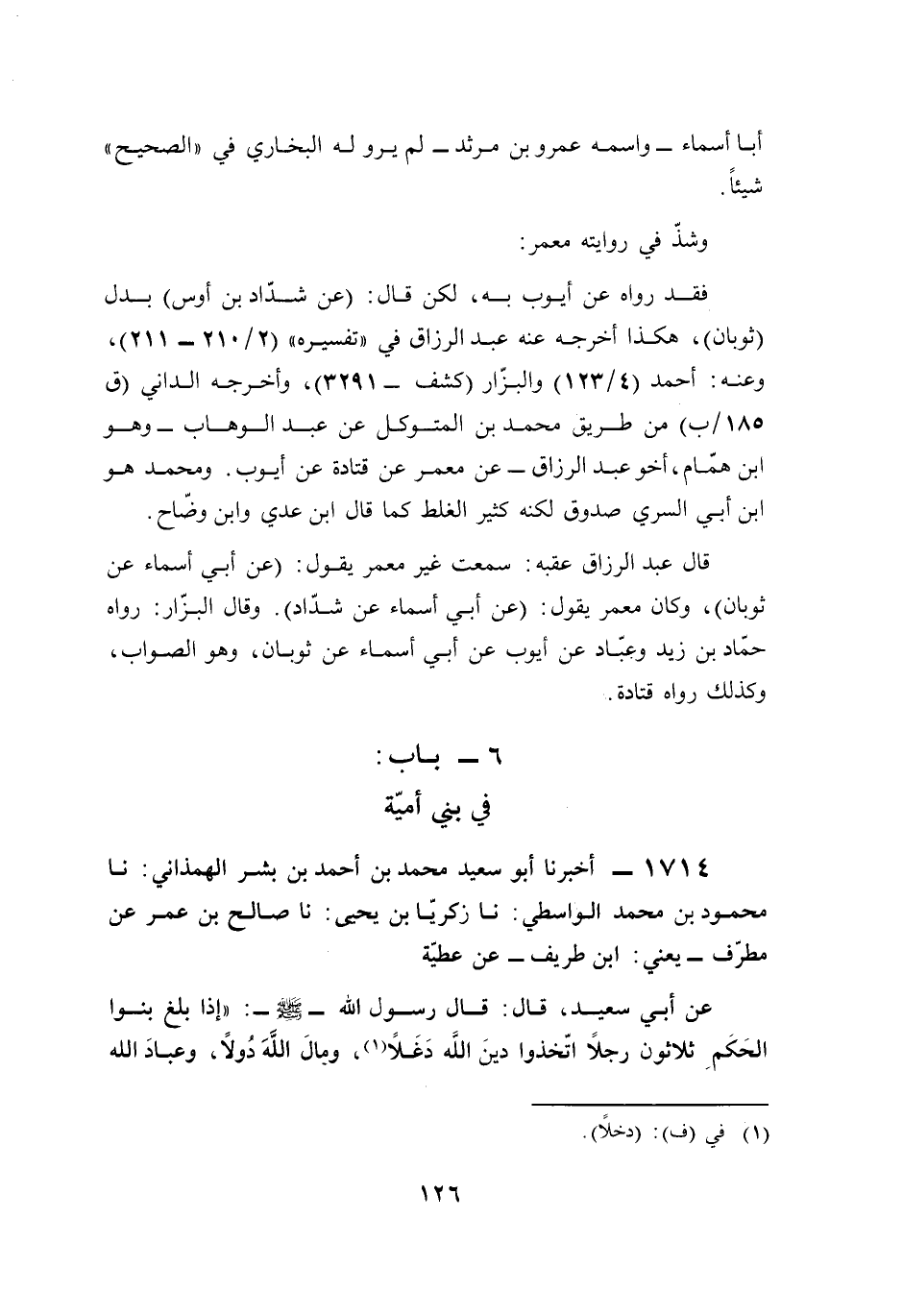 قال عبد الرزاق عقبه: سمعت غير معمر يقول: (عن أبي أسماء عن ثوبان)، وكان معمر يقول: (عن أبي أسماء عن شدّاد). وقال البزّار: رواه حماد بن زيد وعبّاد عن أيوب عن أبي أسماء عن ثوبان، وهو الصواب، وكذلك رواه قتادة.
