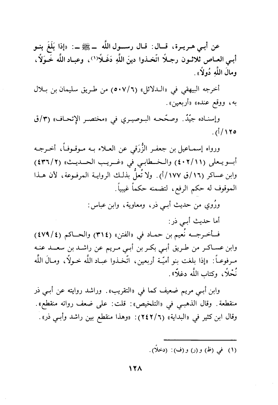 عن أبي هريرة، قال: قال رسول الله - صلى الله عليه وسلم -: "إذا بَلَغَ بنو أبي العاص ثلاثون رجلًا اتّخذوا دينَ اللهِ دَغَلًا (¬1)، وعباد الله خَوَلًا، ومالَ اللهِ دُولًا".