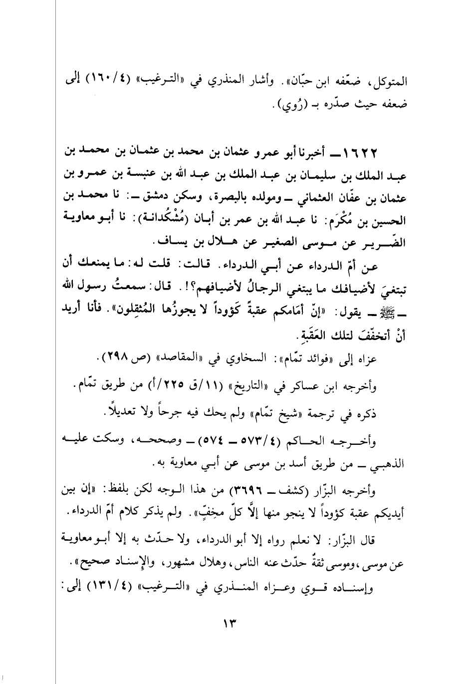 1622 - أخبرنا أبو عمرو عثمان بن محمَّد بن عثمان بن محمَّد بن عبد الملك بن سليمان بن عبد الملك بن عبد الله بن عنبسة بن عمرو بن عثمان بن عفّان العثماني -ومولده بالبصرة، وسكن دمشق-: نا محمَّد بن الحسين بن مُكْرَم: نا عبد الله بن عمر بن أبان (مُشْكُدانة): نا أبو معاوية الضّرير عن موسى الصغير عن هلال بن يساف.