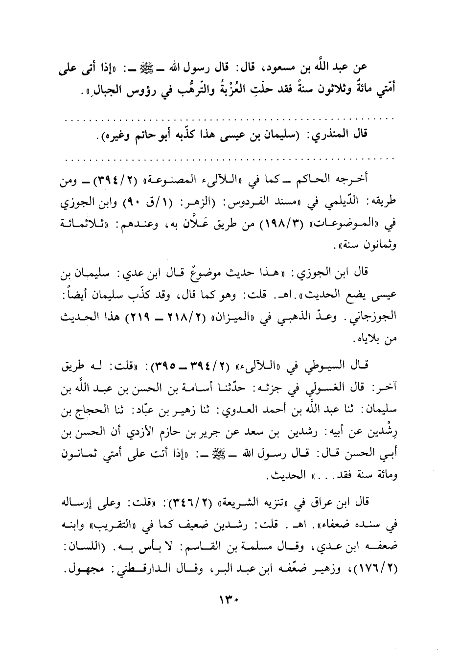 عن عبد الله بن مسعود، قال: قال رسول الله - صلى الله عليه وسلم -: "إذا أتى على أمّتي مائةٌ وثلاثون سنةً فقد حلّتِ العُزْبةُ والتّرهُّب في رؤوس الجبالِ".