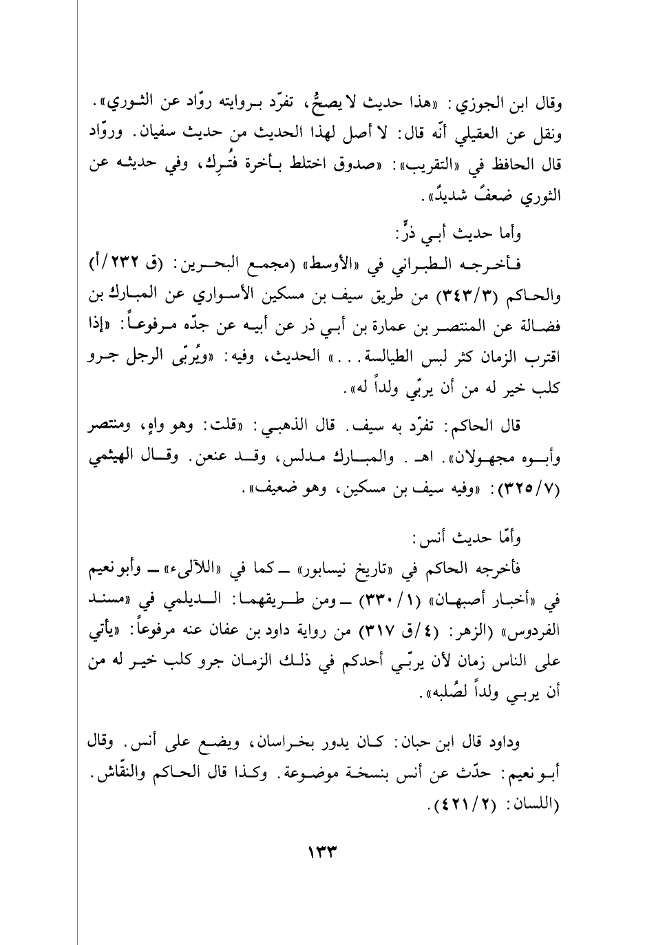 فأخرجه الطبراني في "الأوسط" (مجمع البحرين: (ق 232/ أ) والحاكم (3/ 343) من طريق سيف بن مسكين الأسواري عن المبارك بن فضالة عن المنتصر بن عمارة بن أبي ذر عن أبيه عن جدّه مرفوعًا: "إذا اقترب الزمان كثر لبس الطيالسة ... " الحديث، وفيه: "وُيربّي الرجل جرو كلب خير له من أن يربي ولدًا له".