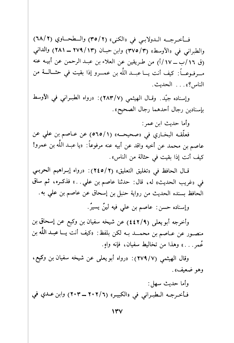 فأخرجه الدولابي في "الكنى" (2/ 35) والطحاوي (2/ 68) والطبراني في "الأوسط" (3/ 375) وابن حبان (13/ 279 - 281) والداني (ق 16/ ب-17/ أ) من طريقين عن العلاء بن عبد الرحمن عن أبيه عنه مرفوعًا: كيف أنت يا عبد الله بن عمرو إذا بقيت في حثالة من الناس؟ " ... الحديث.