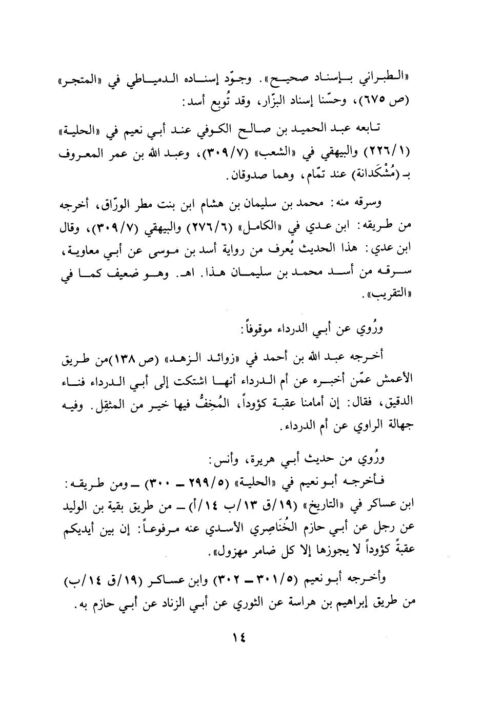 فأخرجه أبو نعيم في "الحلية" (5/ 299 - 300) -ومن طريقه: ابن عساكر في "التاريخ" (19/ ق 13/ ب 14/ أ) - من طريق بقية بن الوليد عن رجل عن أبي حازم الخُنَاصِري الأسدي عنه مرفوعًا: إن بين أيديكم عقبةً كؤودًا لا يجوزها إلا كل ضامر مهزول".
