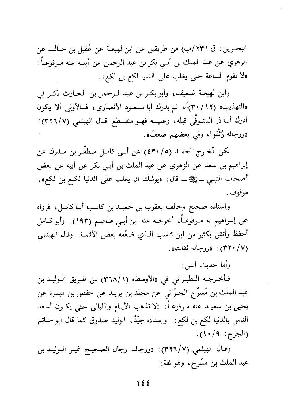 البحرين: ق 231/ ب) من طريقين عن ابن لهيعة عن عُقيل بن خالد عن الزهريّ عن عبد الملك بن أبي بكر بن عبد الرحمن عن أبيه عنه مرفوعًا: "لا تقوم الساعة حتى يغلب على الدنيا لكع بن لكع".