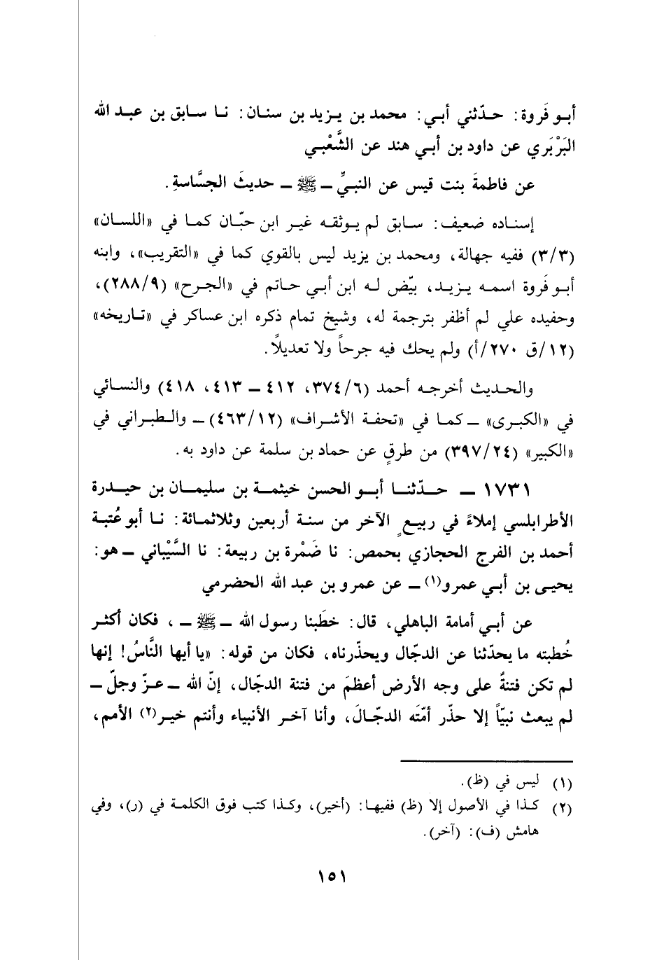 عن فاطمةَ بنت قيس عن النبي - صلى الله عليه وسلم - حديثَ الجسَّاسةِ.