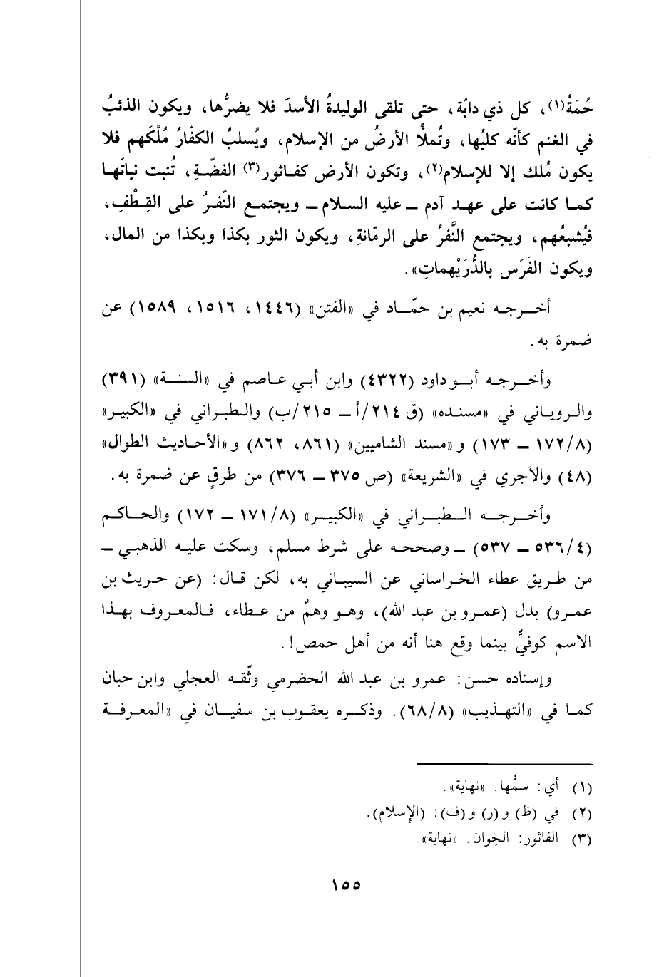 حُمَةُ (¬1)، كل ذي دابّة، حتى تلقى الوليدةُ الأسدَ فلا يضرُّها، ويكون الذئبُ في الغنم كأنّه كلبُها، وتُملأُ الأرضُ من الإِسلام، ويُسلبُ الكفّارُ مُلْكَهم فلا يكون مُلك إلا للإسلام (¬2)، وتكون الأرض كفاثور (¬3) الفضّةِ، تُنبت نباتَها كما كانت على عهد آدم -عليه السلام- ويجتمع النّفرُ على القِطْفِ، فيُشبعُهم، ويجتمع النَّفرُ على الرمّانةِ، ويكون الثور بكذا وبكذا من المال، ويكون الفَرَس بالدُّرَيْهماتِ".