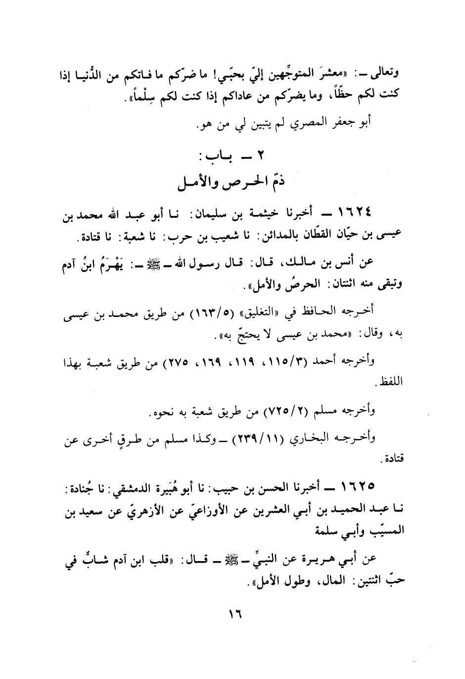 عن أبي هريرة عن النبيِّ - صلى الله عليه وسلم - قال: "قلب ابن آدم شابٌّ في حبّ اثنتين: المال، وطول الأمل".