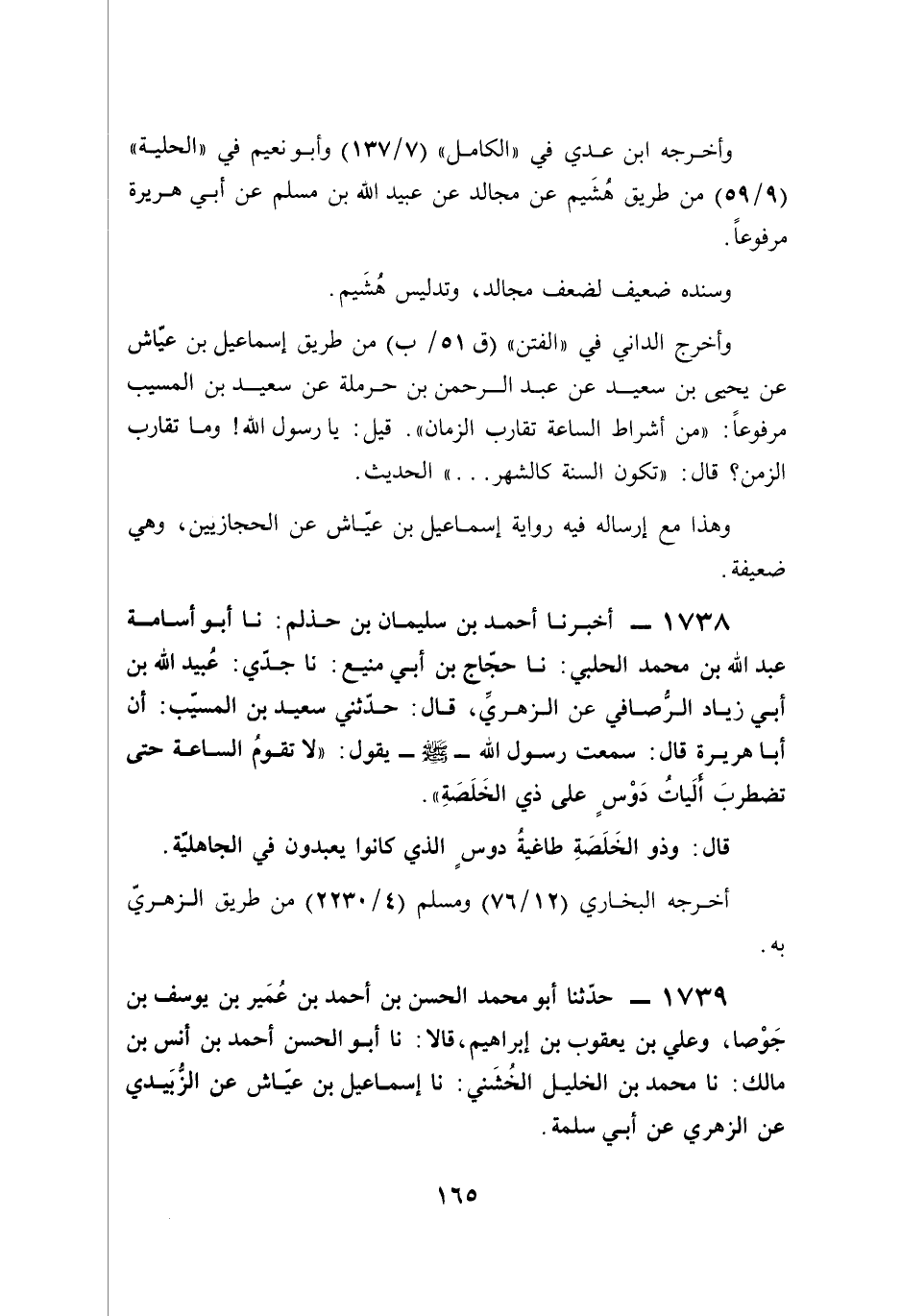 1738 - أخبرنا أحمد بن سليمان بن حذلم: نا أبو أسامة عبد الله بن محمد الحلبي: نا حجّاج بن أبي منيع: نا جدّي: عُبيد الله بن أبي زياد الرُّصافي عن الزهريِّ، قال: حدّثني سعيد بن المسيّب: أن أبا هريرة قال: سمعت رسول الله - صلى الله عليه وسلم - يقول: "لا تقومُ الساعة حتى تضطربَ أَلَياتُ دَوْسٍ على ذي الخَلَصَةِ".