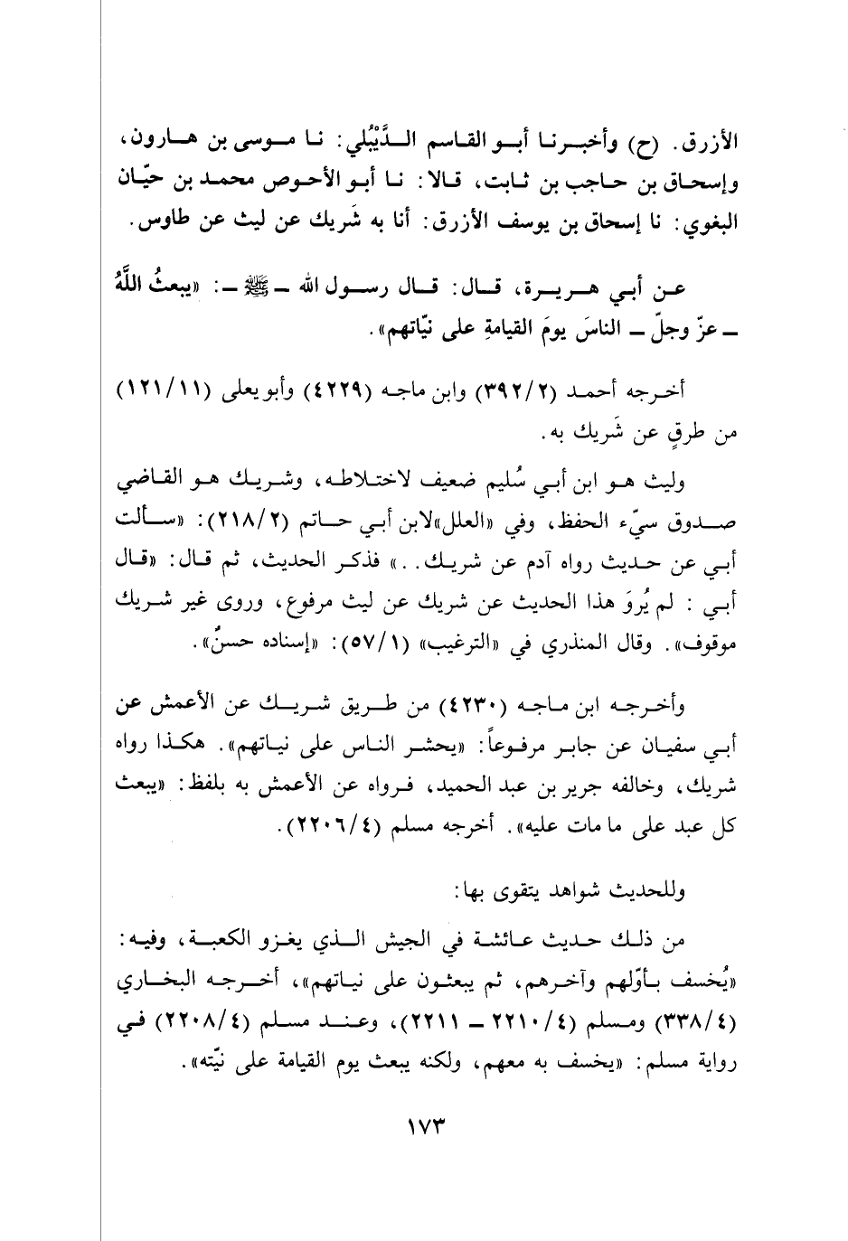 عن أبي هريرة، قال: قال رسول الله - صلى الله عليه وسلم -: "يبعثُ اللهُ -عَزَّ وجَلَّ- الناسَ يومَ القيامةِ على نيّاتهم".
