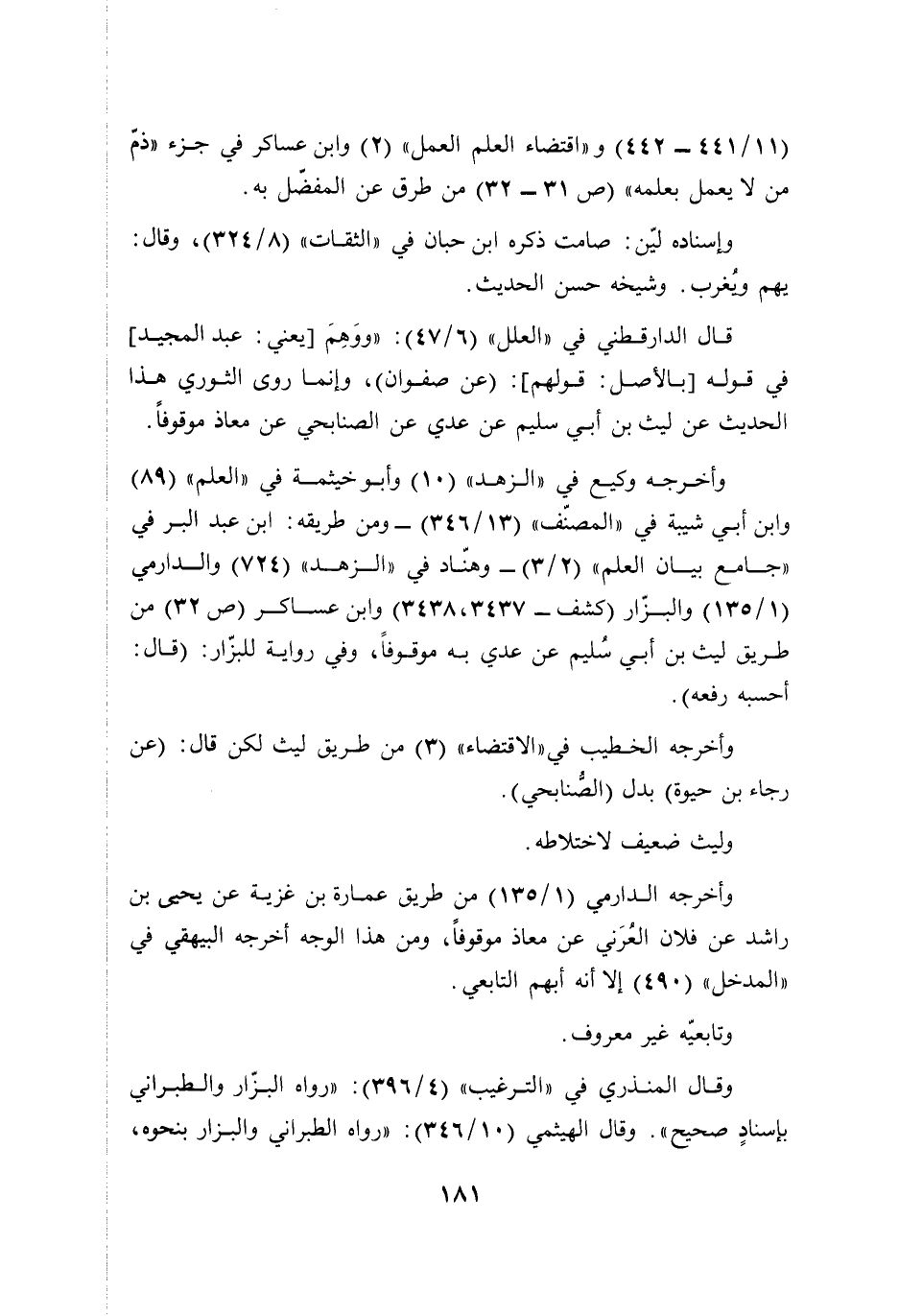 وأخرجه وكيع في "الزهد" (10) وأبو خيثمة في "العلم" (89) وابن أبي شيبة في "المصنّف" (13/ 346) -ومن طريقه: ابن عبد البر في "جامع بيان العلم" (2/ 3) - وهنّاد في "الزهد" (724) والدارمي (1/ 135) والبزّار (كشف - 3437، 3438) وابن عساكر (ص 32) من طريق ليث بن أبي سُليم عن عدي به موقوفًا، وفي رواية للبزّار: (قال: أحسبه رفعه).