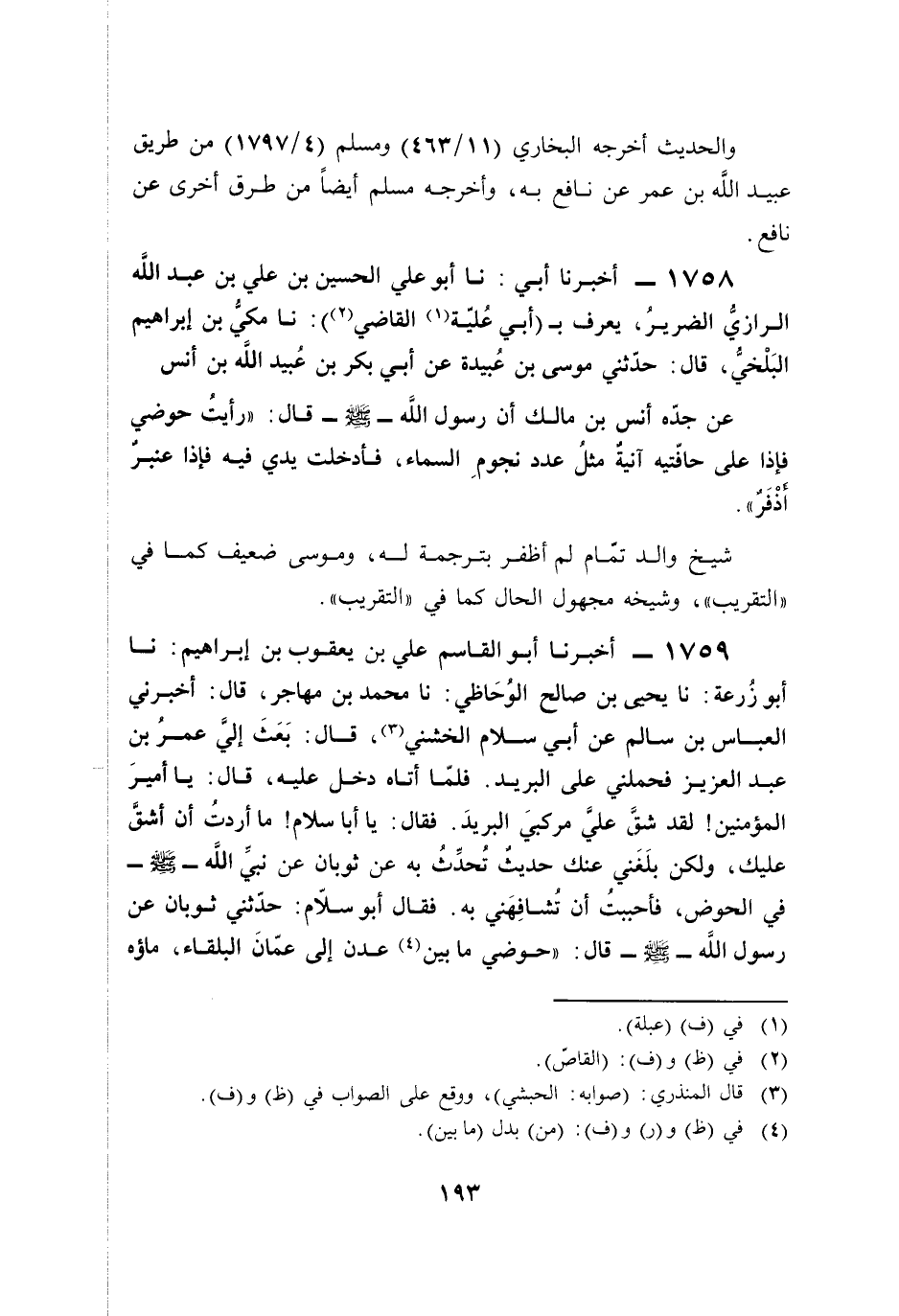 1759 - أخبرنا أبو القاسم علي بن يعقوب بن إبراهيم: نا أبو زُرعة: نا يحيى بن صالح الوُحَاظي: نا محمد بن مهاجر، قال: أخبرني العباس بن سالم عن أبي سلام الخشني (¬3)، قال: بَعَثَ إليَّ عمرُ بن عبد العزيز فحملني على البريد. فلمّا أتاه دخل عليه، قال: يا أميرَ المؤمنين! لقد شقَّ عليَّ مركبيَ البريدَ. فقال: يا أبا سلام! ما أردت أن أشقَّ عليك، ولكن بلَغَني عنك حديثٌ تُحدِّثُ به عن ثوبان عن نبيِّ الله - صلى الله عليه وسلم - في الحوض، فأحببتُ أن تُشافِهَني به. فقال أبو سلّام: حدّثني ثوبان عن رسول الله - صلى الله عليه وسلم - قال: "حوضي ما بين (¬4) عدن إلى عمّانَ البلقاء، ماؤه