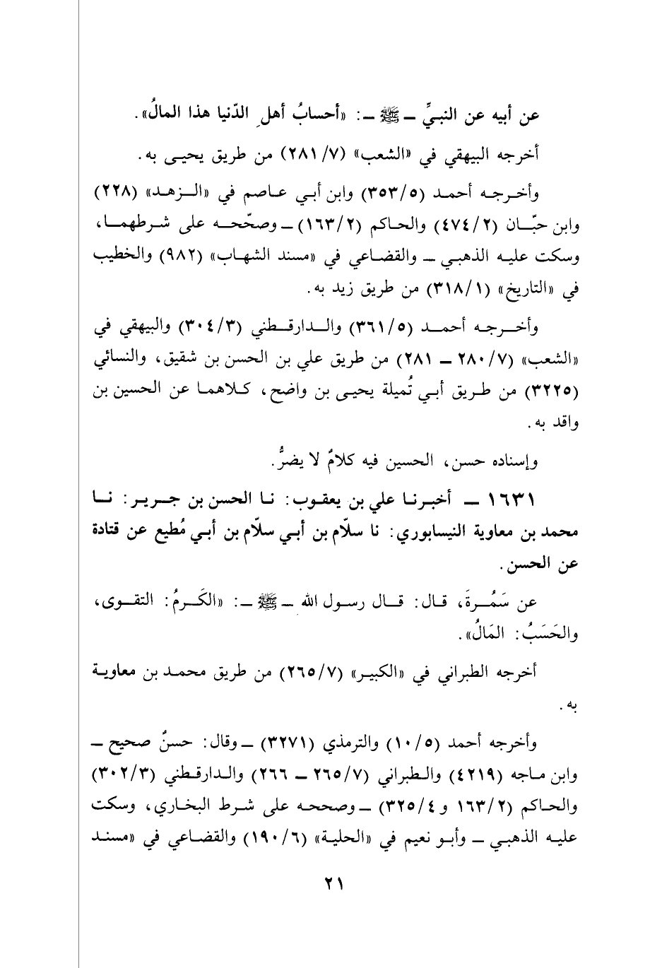 عن أبيه عن النبيِّ - صلى الله عليه وسلم -: "أحسابُ أهلِ الدّنيا هذا المالُ".