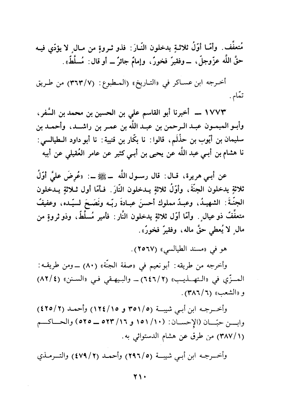 مُتعفِّف. وأمّا أوّلُ ثلاثةٍ يدخلون النّارَ: فذو ثروةٍ من مالٍ لا يؤدّي فيه حقَّ الله عَزَّ وَجَلَّ، -وفقيرٌ فخورٌ، وإمامٌ جائرٌ- أو قال: مُسلَّطٌ".