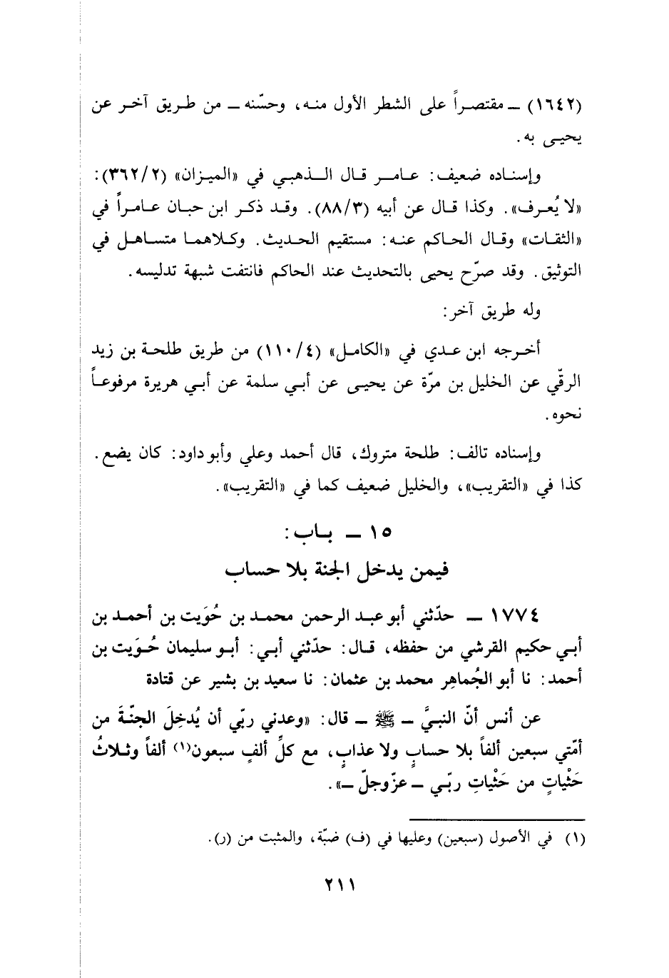 1774 - حدّثني أبو عبد الرحمن محمد بن حُوَيت بن أحمد بن أبي حكيم القرشي من حفظه، قال: حدّثني أبي: أبو سليمان حُوَيت بن أحمد: نا أبو الجُماهِر محمد بن عثمان: نا سعيد بن بشير عن قتادة