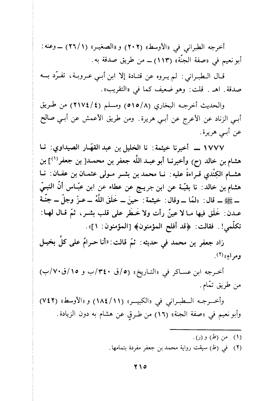 1777 - أخبرنا خيثمة: نا الخليل بن عبد القهّار الصيداوي: نا هشام بن خالد (ح) وأخبرنا أبو عبد الله جعفر بن محمد [بن جعفر (¬1)] بن هشام الكِنْدي قراءةً عليه: نا محمد بن بشر مولى عثمان بن عفان: نا هشام بن خالد: نا بقيّة عن ابن جريج عن عطاء عن ابن عبّاس أنّ النبيّ - صلى الله عليه وسلم - قال: "لمّا -وقال: خيثمة: حينَ- خَلَقَ اللهُ -عَزَّ وَجَلَّ- جنّة عدن: خَلَق فيها ما لاعينٌ رأت ولا خَطَر على قلب بشر، ثمّ قال لها: تكلّمي!. فقالت: {قَدْ أَفْلَحَ الْمُؤْمِنُونَ} [المؤمنون: 1] ".