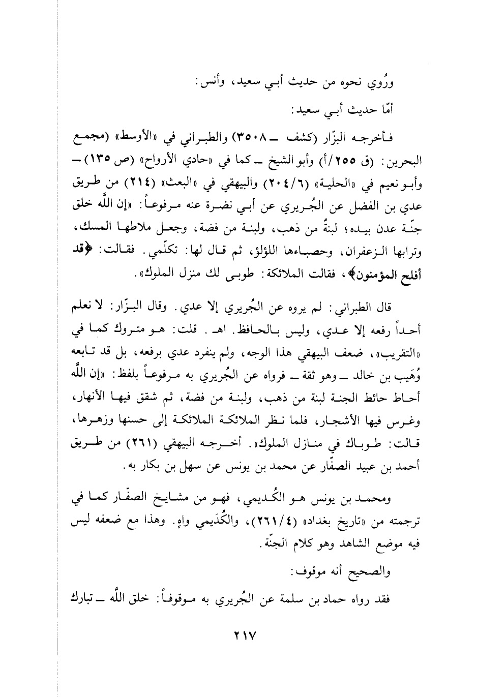قال الطبراني: لم يروه عن الجُريري إلا عدي. وقال البزّار: لا نعلم أحدًا رفعه إلا عدي، وليس بالحافظ. أهـ. قلت: هو متروك كما في "التقريب"، ضعف البيهقي هذا الوجه، ولم ينفرد عدي برفعه، بل قد تابعه وُهَيب بن خالد -وهو ثقة- فرواه عن الجُريري به مرفوعًا بلفظ: "إن الله أحاط حائط الجنة لبنة من ذهب، ولبنة من فضة، ثم شقق فيها الأنهار، وغرس فيها الأشجار، فلما نظر الملائكة إلى حسنها وزهرها، قالت: طوباك في منازل الملوك". أخرجه البيهقي (261) من طريق أحمد بن عبيد الصفّار عن محمد بن يونس عن سهل بن بكار به.