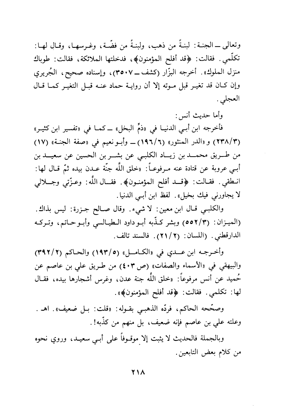 وتعالى- الجنة: لبنةً من ذهب، ولبنةً من فضّة، وغرسها، وقال لها: تكلّمي. فقالت: {قَدْ أَفْلَحَ الْمُؤْمِنُونَ}، فدخلتها الملائكة، فقالت: طوباك منزل الملوك". أخرجه البزّار (كشف- 3507)، وإسناده صحيح، الجُريري وإن كان قد تغير قبل موته إلا أن رواية حماد عنه قبل التغير كما قال