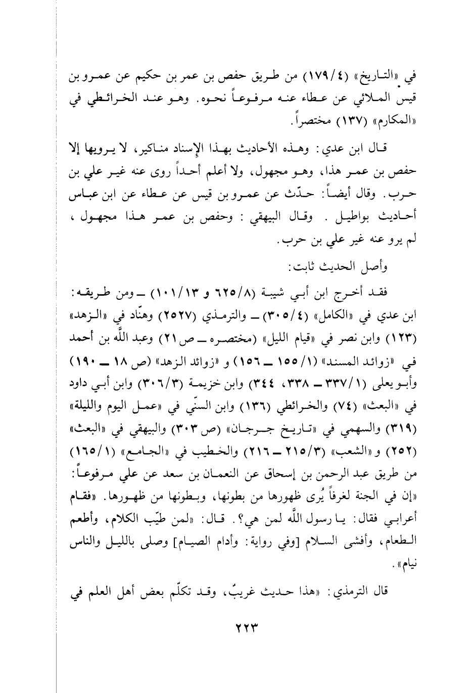 فقد أخرج ابن أبي شيبة (8/ 625 و 13/ 101) -ومن طريقه: ابن عدي في "الكامل" (4/ 305) - والترمذي (2527) وهنّاد في "الزهد" (123) وابن نصر في "قيام الليل" (مختصره - ص 21) وعبد الله بن أحمد في "زوائد المسند" (1/ 155 - 156) و"زوائد الزهد" (ص 18 - 190) وأبو يعلى (1/ 337 - 338، 344) وابن خزيمة (3/ 306) وابن أبي داود في "البعث" (74) والخرائطي (136) وابن السنّي في "عمل اليوم والليلة" (319) والسهمي في "تاريخ جرجان" (ص 303) والبيهقي في "البعث" (252) و"الشعب" (3/ 215 - 216) والخطيب في "الجامع" (1/ 165) من طريق عبد الرحمن بن إسحاق عن النعمان بن سعد عن علي مرفوعًا: "إن في الجنة لغرفًا يُرى ظهورها من بطونها، وبطونها من ظهورها. "فقام أعرابي فقال: يا رسول الله لمن هي؟. قال: "لمن طيّب الكلام، وأطعم الطعام، وأفشى السلام [وفي رواية: وأدام الصيام] وصلى بالليل والناس نيام".